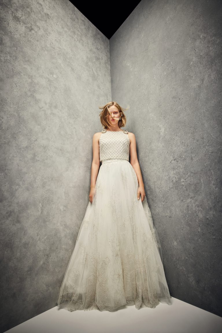 Combinazione di corpetto gioiello in tulle ricamato con cristalli geometrici e gonna vaporosa in tulle velata con ricamo gioiello floreale.