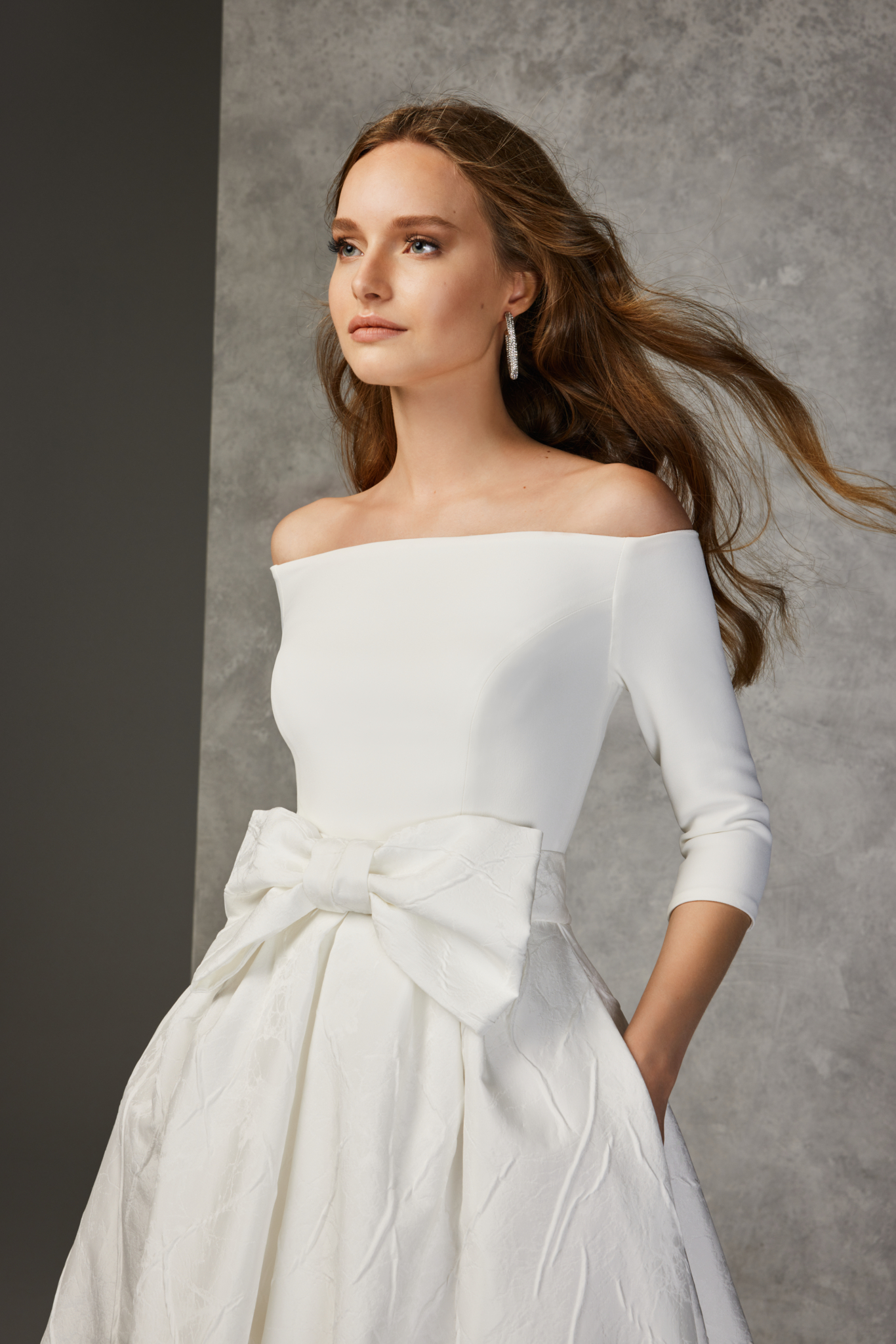 Abito da sposa con corpetto “cutaway” e manica 3/4 in crêpe. Gonna con spacco e fiocco in “taffetà Mármol”.