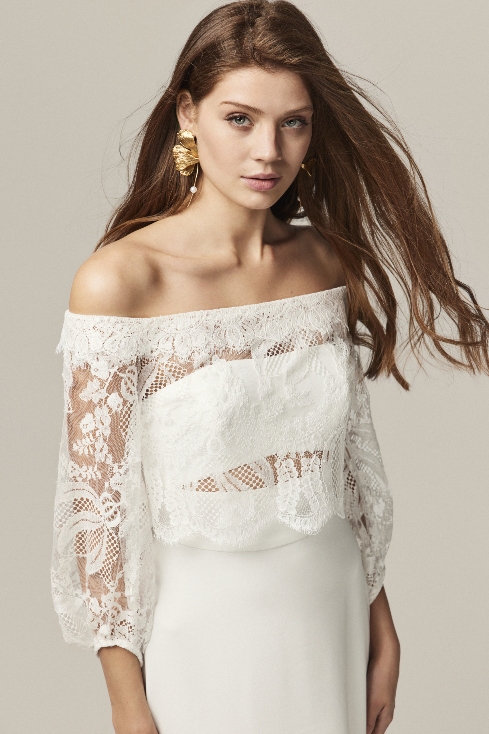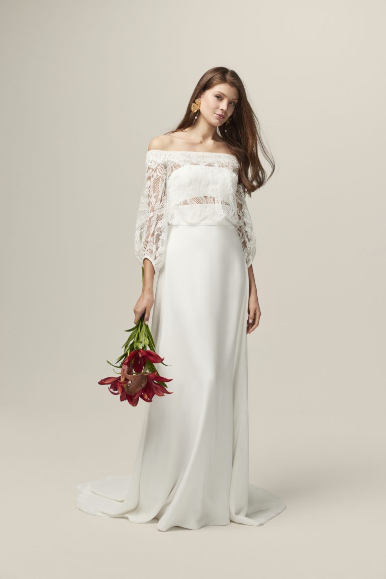 Abito da sposa cut-out in crêpe e corpetto in pizzo chantilly geometrico.