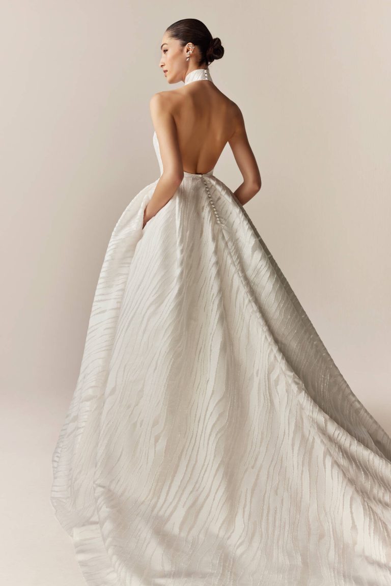 Con l’idea di gestire la luce e metterla al servizio della silhouette, Jesus Peiro ha sviluppato disegni con tessuti che aprissero la strada alla luce: devoré, broccati, fil coupé; il raso e molti altri.