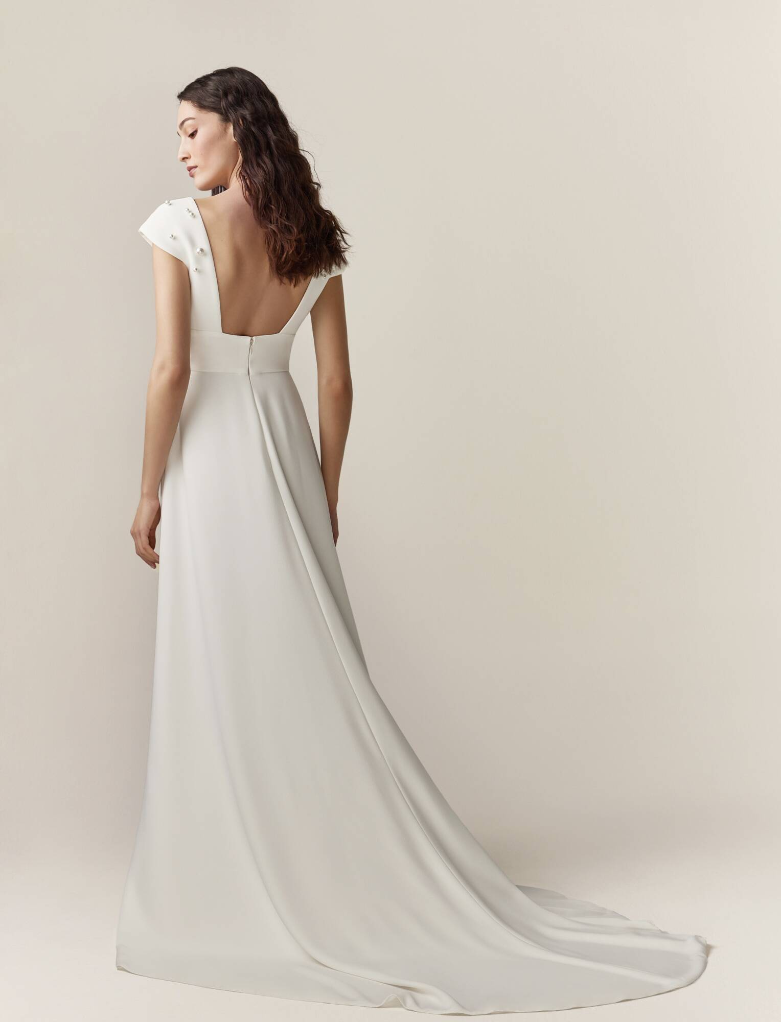 Abito da sposa realizzato in crêpe con fasce drappeggiate e perle cosparse su tutta la silhouette. Gonna a trapezio con apertura centrale.