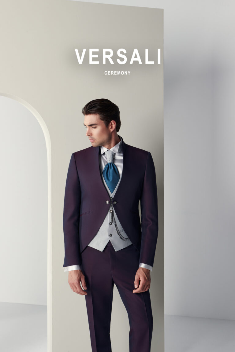 Abito tre pezzi in viola melanzana intenso, impreziosito dal revers alla coreana che conferisce al completo un fascino moderno e distinto. Il gilet grigio perla con motivo damascato e il plastron blu pavone aggiungono un raffinato contrasto cromatico, ideale per cerimonie serali o location eleganti.