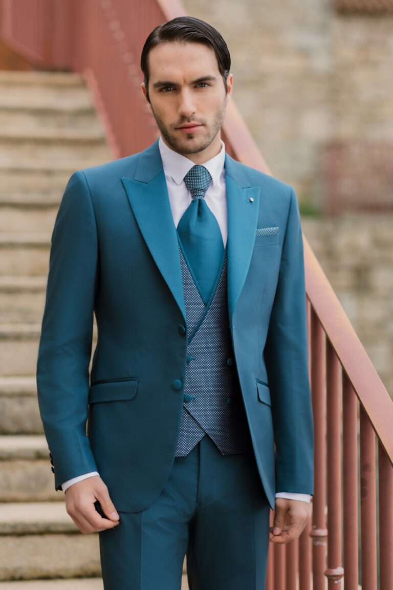 Abito da sposo Thomas Pina in una sofisticata tonalità verde petrolio. La giacca monopetto con rever a lancia in raso è abbinata a gilet e cravattone coordinati in tessuto micro-jacquard, che donano contrasto e luminosità al completo. Un look moderno e distintivo.