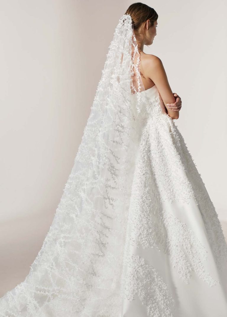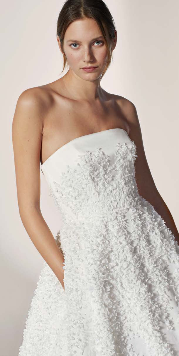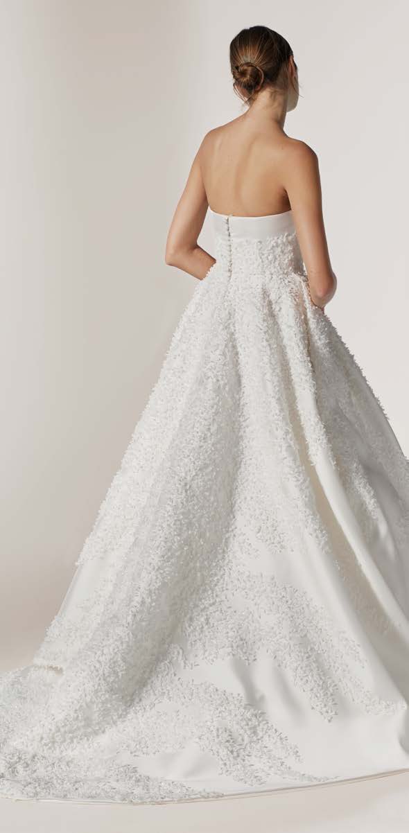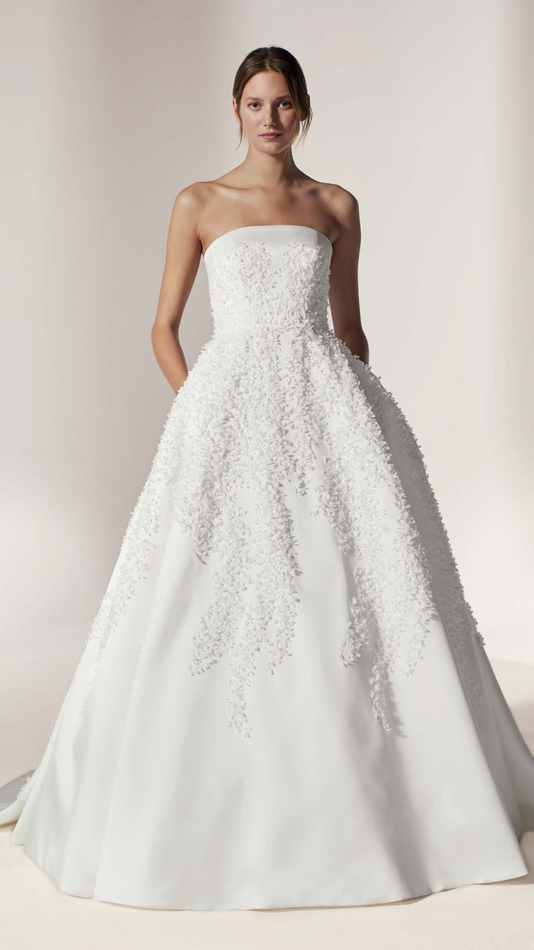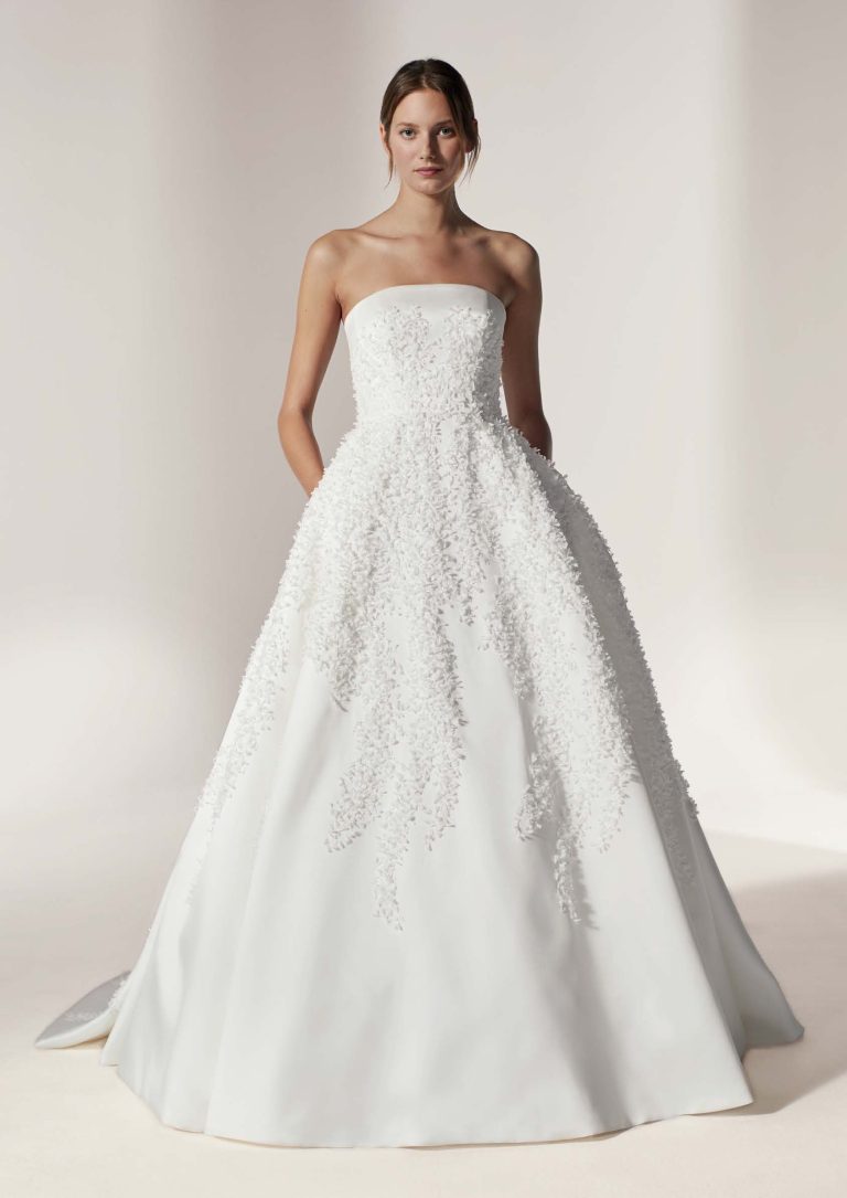 Abito da sposa senza spalline a grande volume in mikado di seta e cotone, ricamato Cornely con filo fantasia in cellulosa e Lurex. Ricamo posizionato in modo asimmetrico.