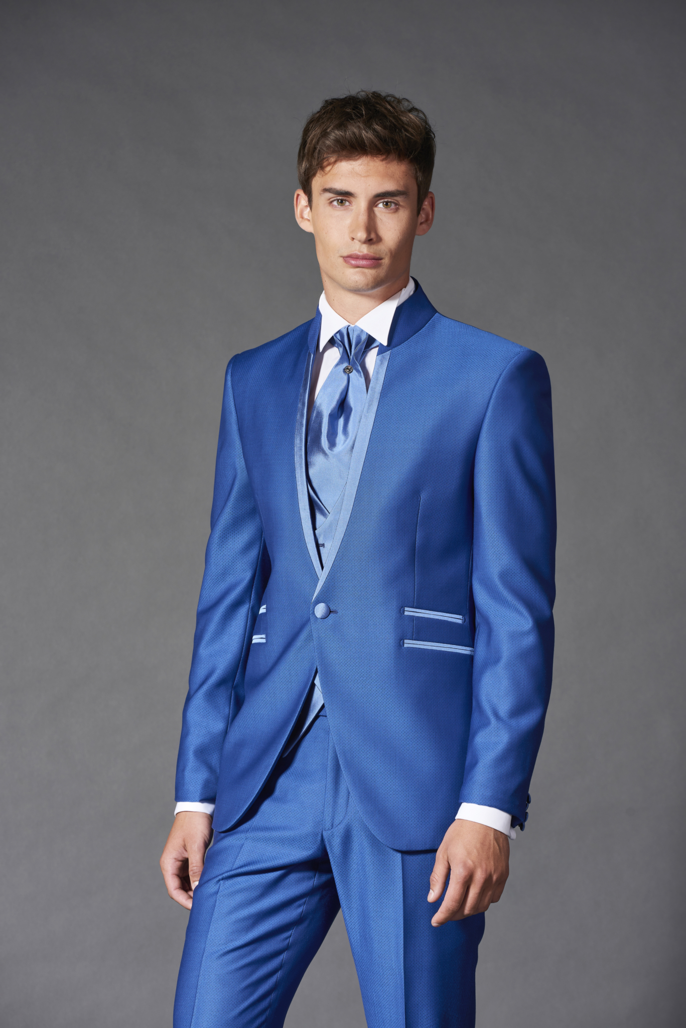 Abito da sposo blu in tessuto satinato con dettagli a contrasto. Perfetto per uno sposo audace e contemporaneo, che desidera un look elegante ma fuori dagli schemi.