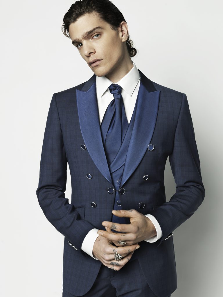 Abito da sposo elegante e moderno, caratterizzato da una giacca monopetto blu con micro fantasia, rever sciallato in raso blu royal a contrasto e bottoni decorativi metallici applicati su entrambi i lati. Completa il look il gilet coordinato e la cravatta plastron tono su tono, per uno stile ricercato e sofisticato che valorizza la figura dello sposo.