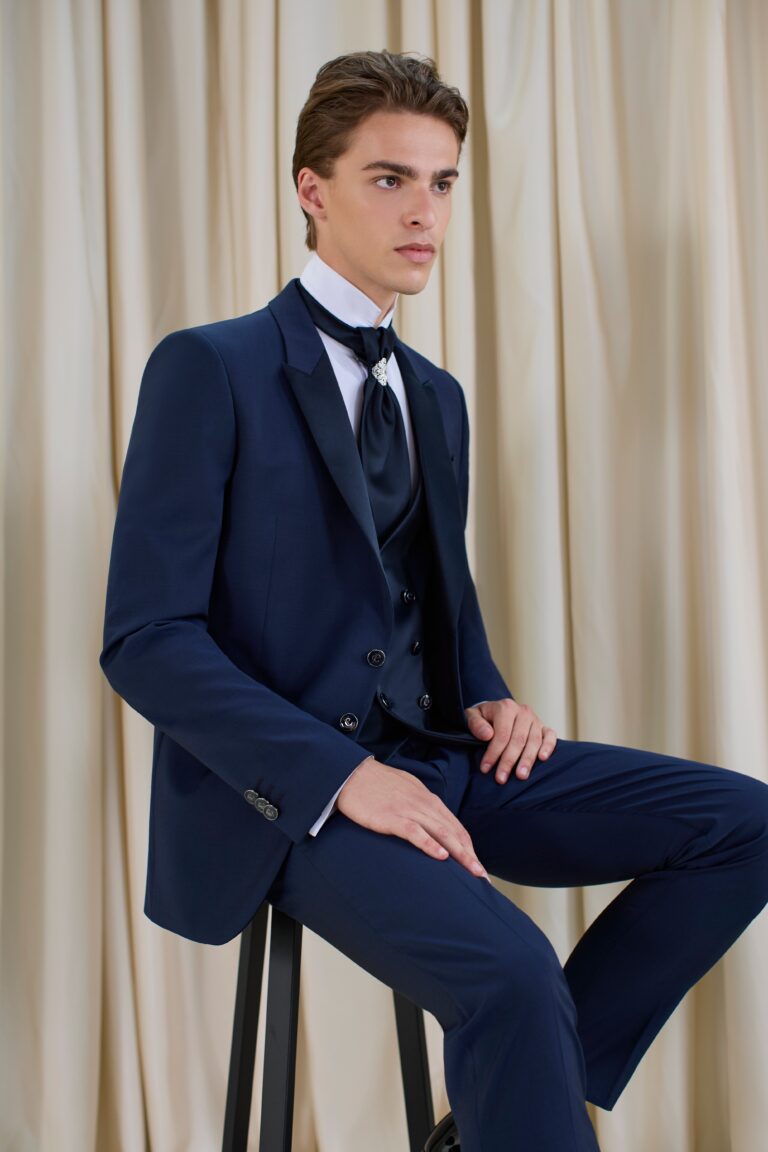 Abito da sposo Carlo Pignatelli in raffinata tonalità blu notte. La giacca monopetto con rever in raso è abbinata a gilet doppiopetto e plastron coordinato, arricchito da un fermaglio gioiello che dona luminosità e ricercatezza. Un completo dallo stile elegante e intramontabile che assicura comfort e una vestibilità ottimale.