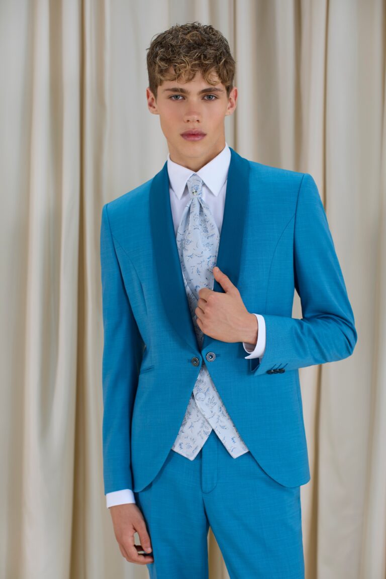 Abito da sposo Carlo Pignatelli in una luminosa tonalità azzurro cielo. La giacca con rever sciallato in raso è abbinata a gilet e plastron coordinati in tessuto jacquard a motivo floreale, che aggiungono raffinatezza e un tocco di romanticismo. Un look elegante e contemporaneo, perfetto per lo sposo che desidera distinguersi con stile e personalità.