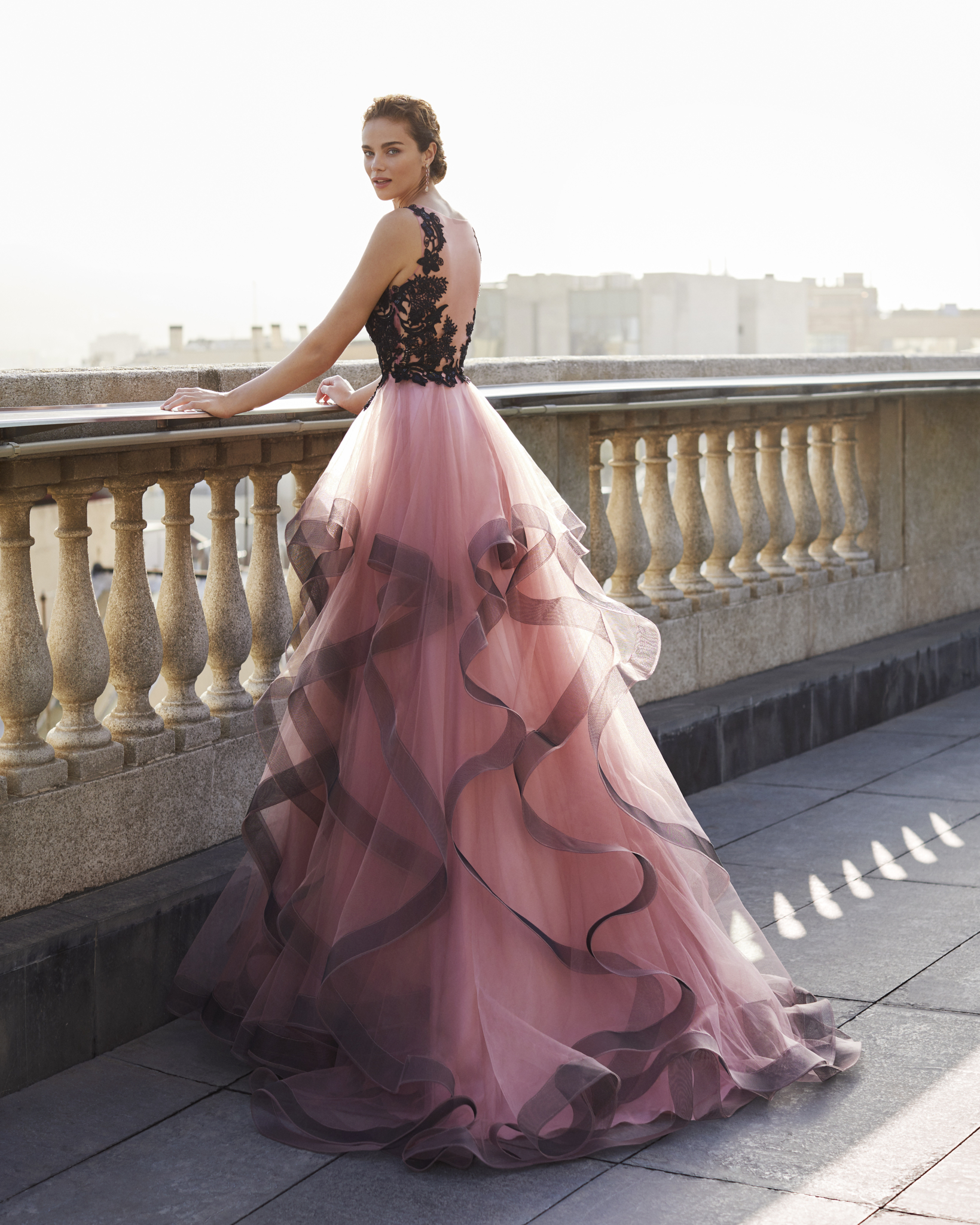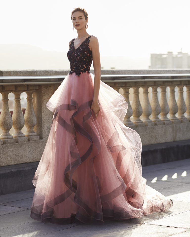 Abito da cerimonia in tulle e corpetto in pizzo e strass. Scollo a V e schiena coperta.