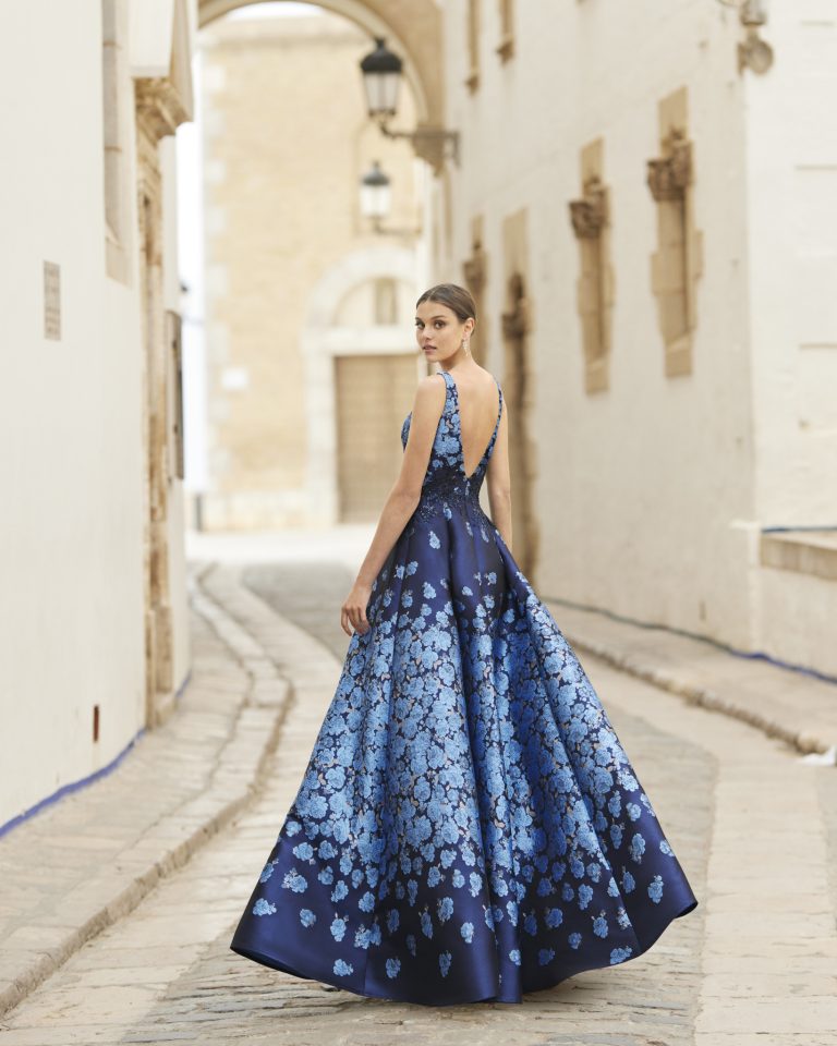 Abito da cerimonia in broccato. Scollo a V sul davanti e sulla schiena. Con stola.