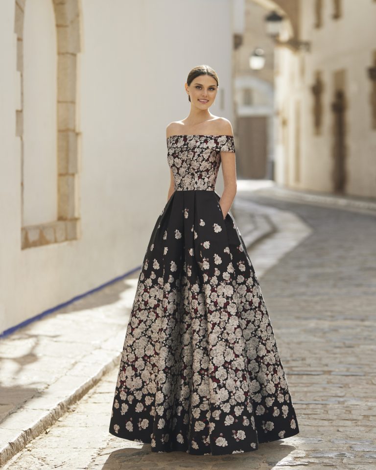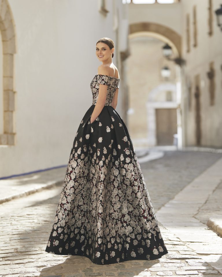 Abito da cerimonia in broccato. Scollo omerale e schiena scollata. Classe ed eleganza per essere l’invitata perfetta!