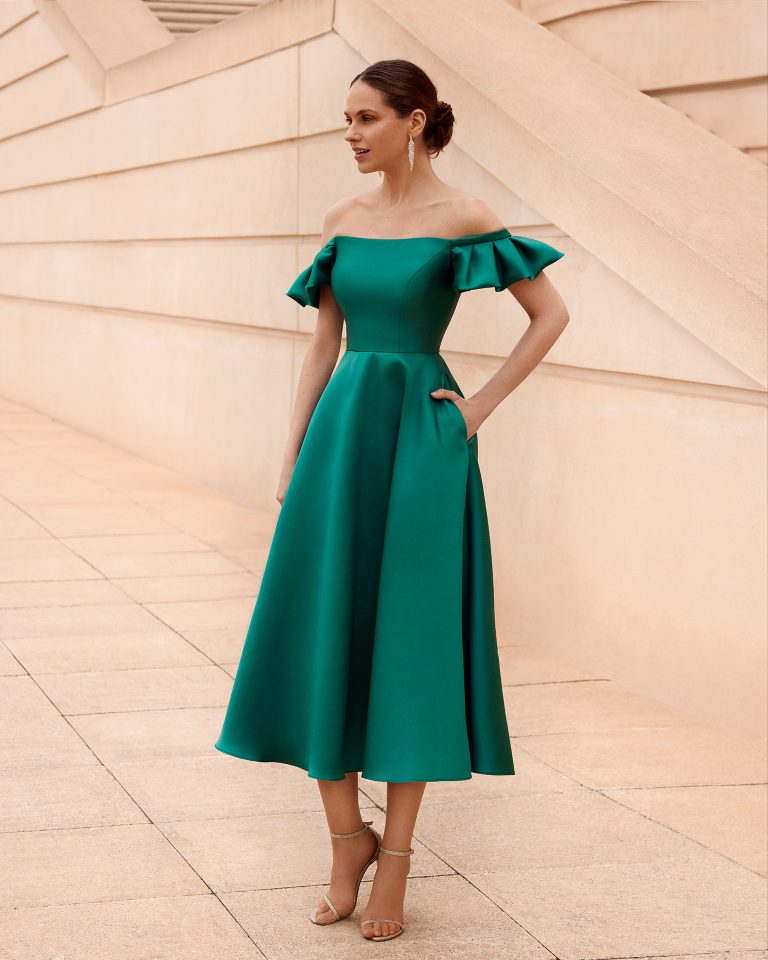 Abito da cerimonia corto confezionato in pregiato mikado. Modello della collezione Couture Club caratterizzato dalle maniche off shoulders, tendenza degli ultimi anni.
