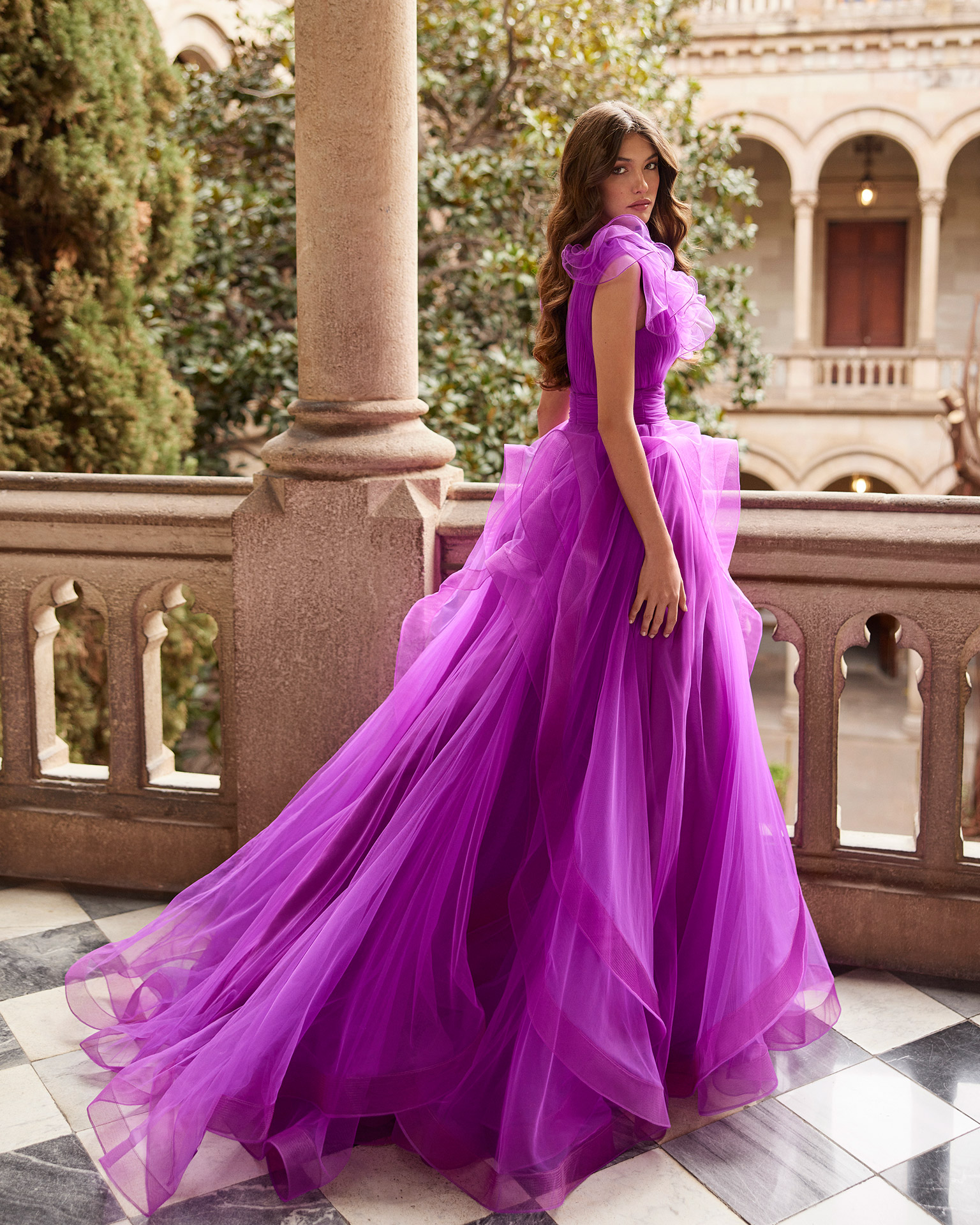 Abito da cerimonia lungo e principesco, realizzato in morbido tulle.
