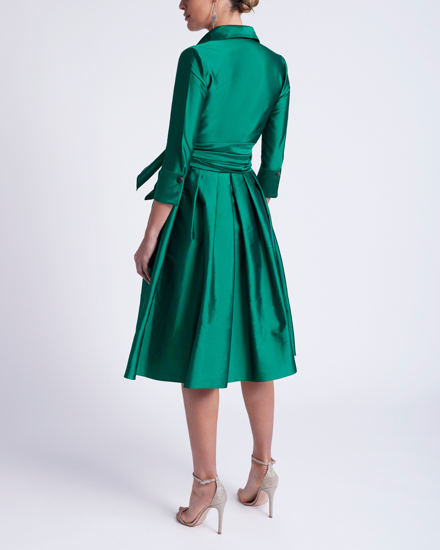 Modello di Rosa Clará Cocktail, caratterizzato da uno scollo chemisier incrociato e schiena coperta, con maniche francesi e chiusura con bottone gioiello.