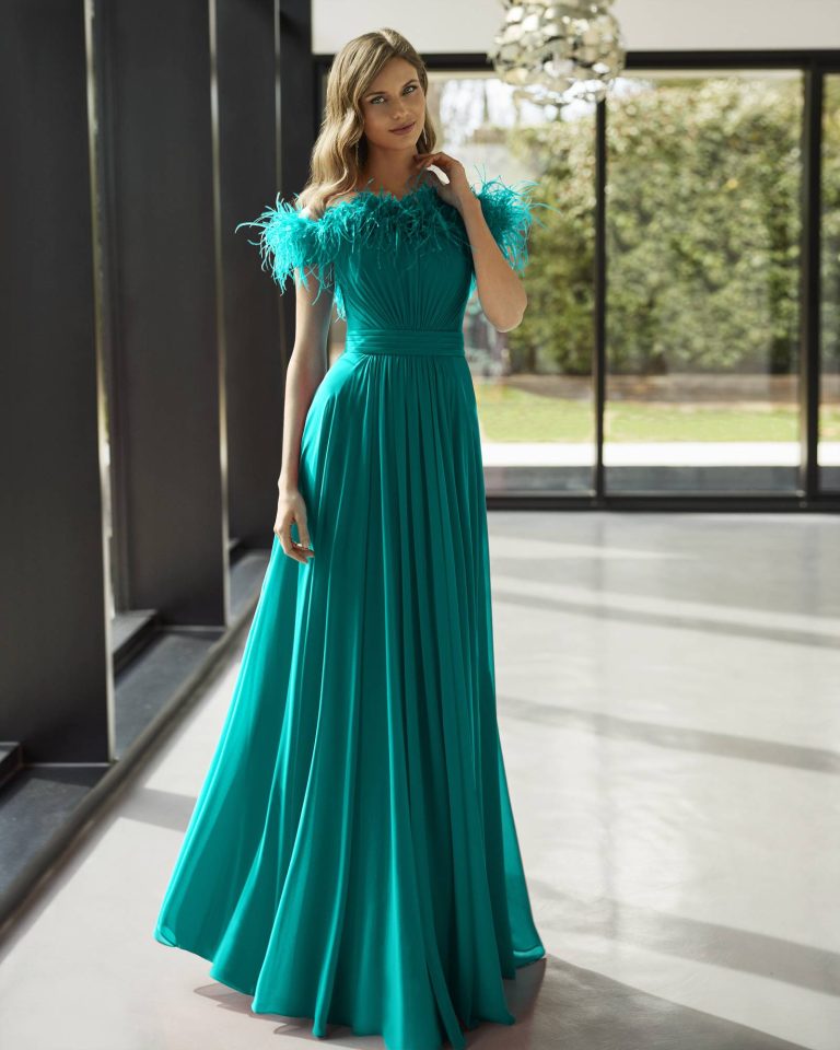 Abito da cocktail elegante. Realizzato in georgette con piume. Con scollo sotto le spalle. Modello Marfil Barcelona di tendenza.