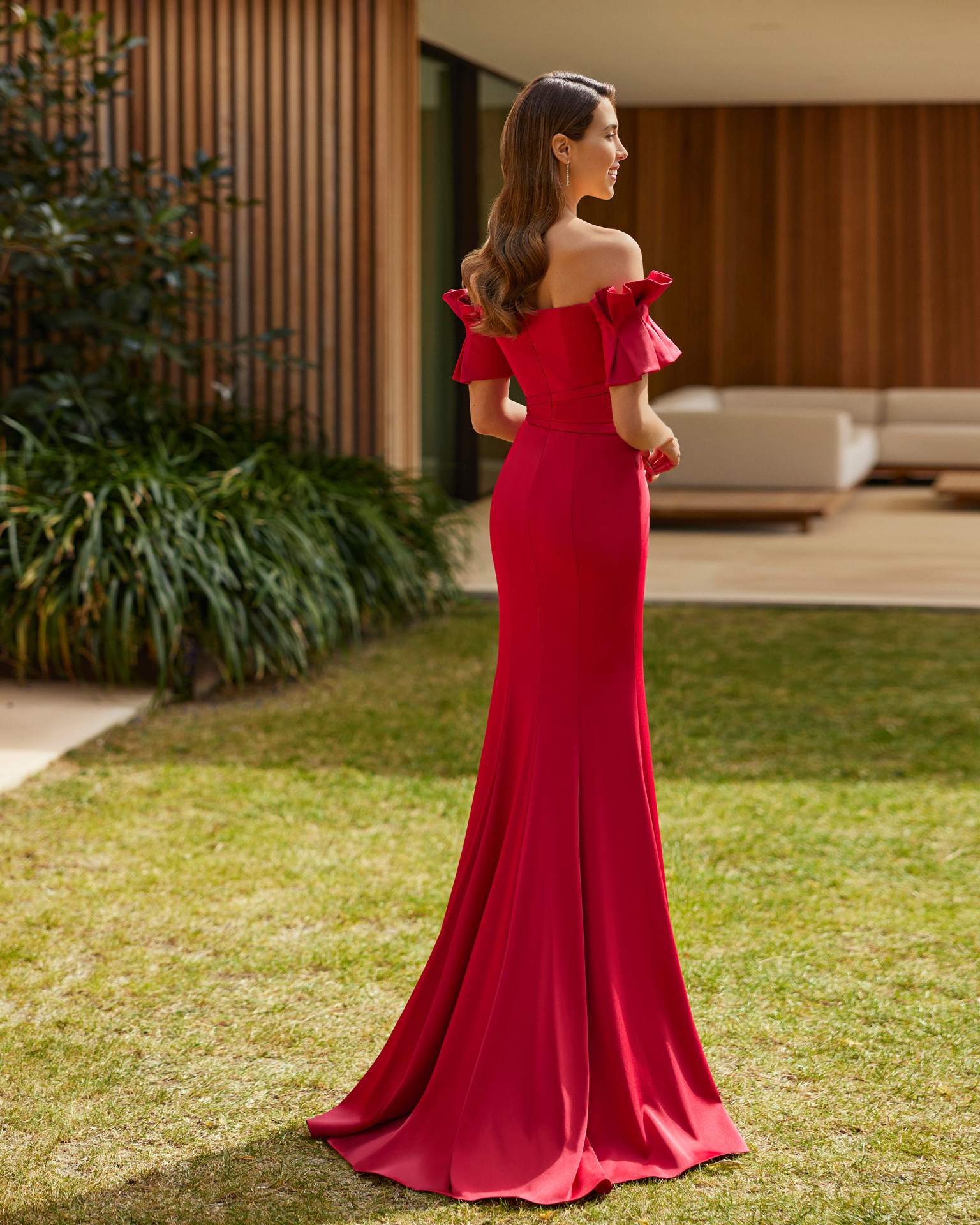 Abito da cerimonia lungo ed elegante. Realizzato in crêpe, con scollo a cuore e schiena coperta.