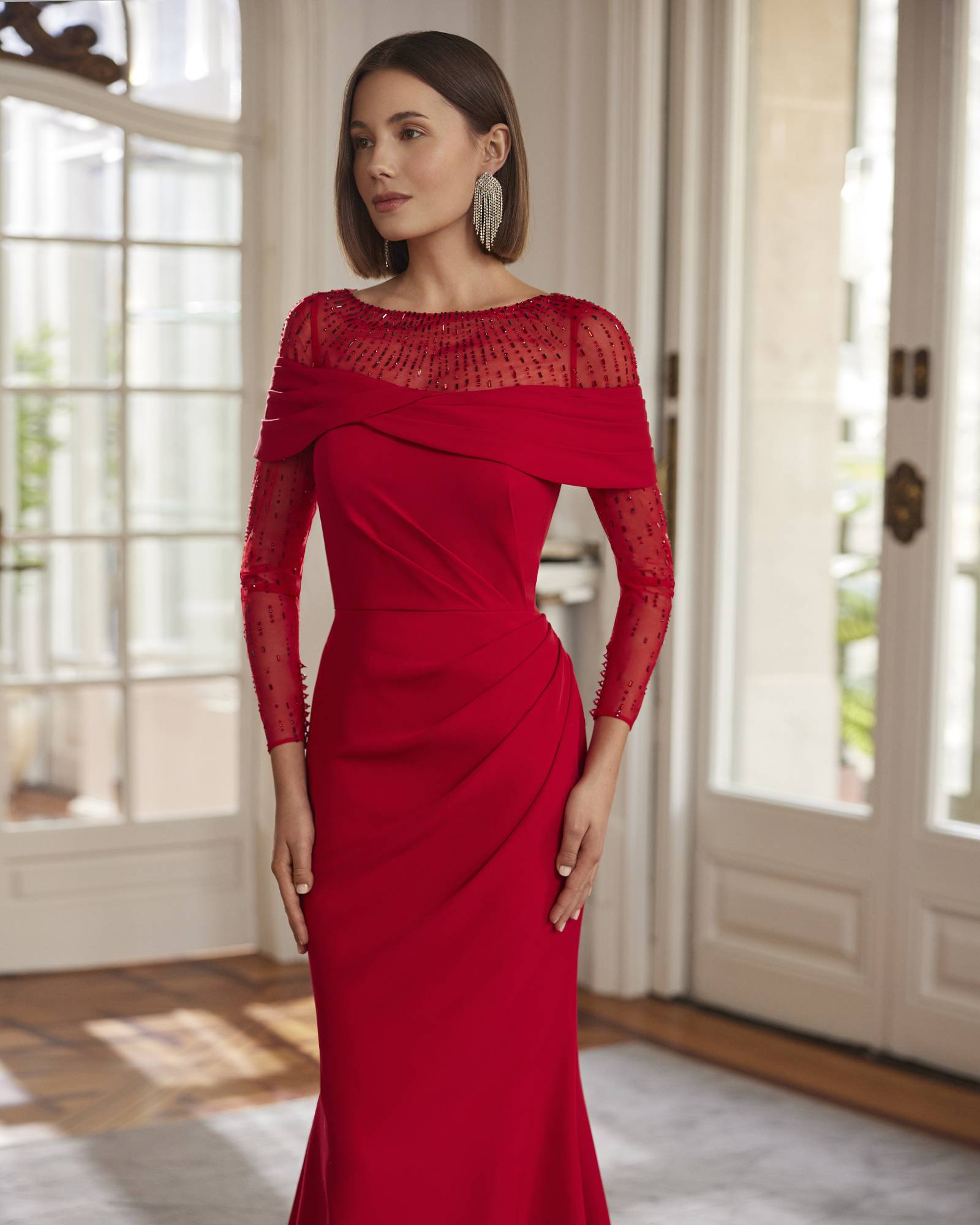 Abito da cerimonia lungo ed estremamente elegante, composto da due pezzi, realizzato in crêpe elasticizzato e strass. Con scollo a barchetta, schiena chiusa e maniche lunghe. Modello Marfil Barcelona.