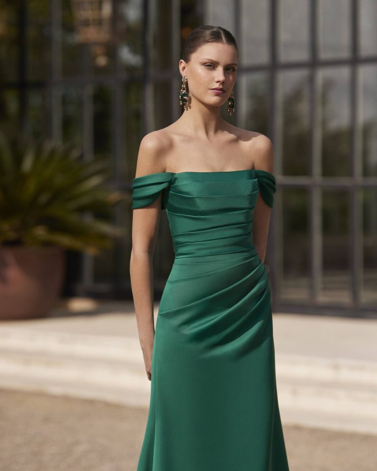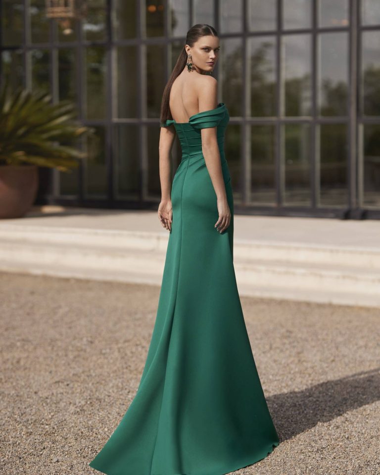 Abito da cerimonia haute couture realizzato in raso. Presenta uno scollo senza spalline, schiena scoperta e corpetto senza maniche. Un look Marfil Barcellona.