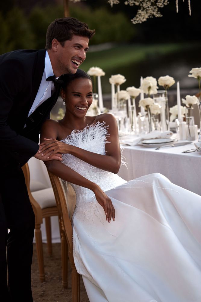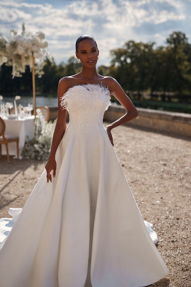 Agness è un modello da sogno, un affascinante abito da sposa senza spalline ornato di piume sottili sulla scollatura. Le piume si estendono attraverso la parte superiore della gonna a tutto volume. L’abito è realizzato in raso e pizzo nei toni dell’avorio. Degno di nota il lungo e romantico strascico.