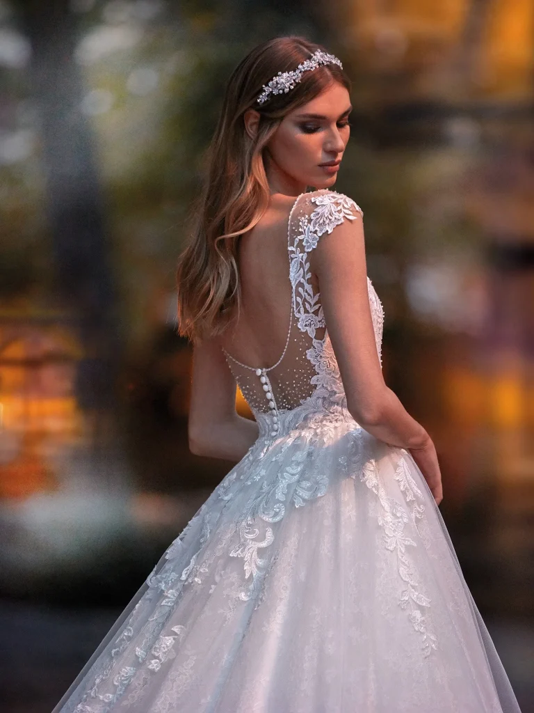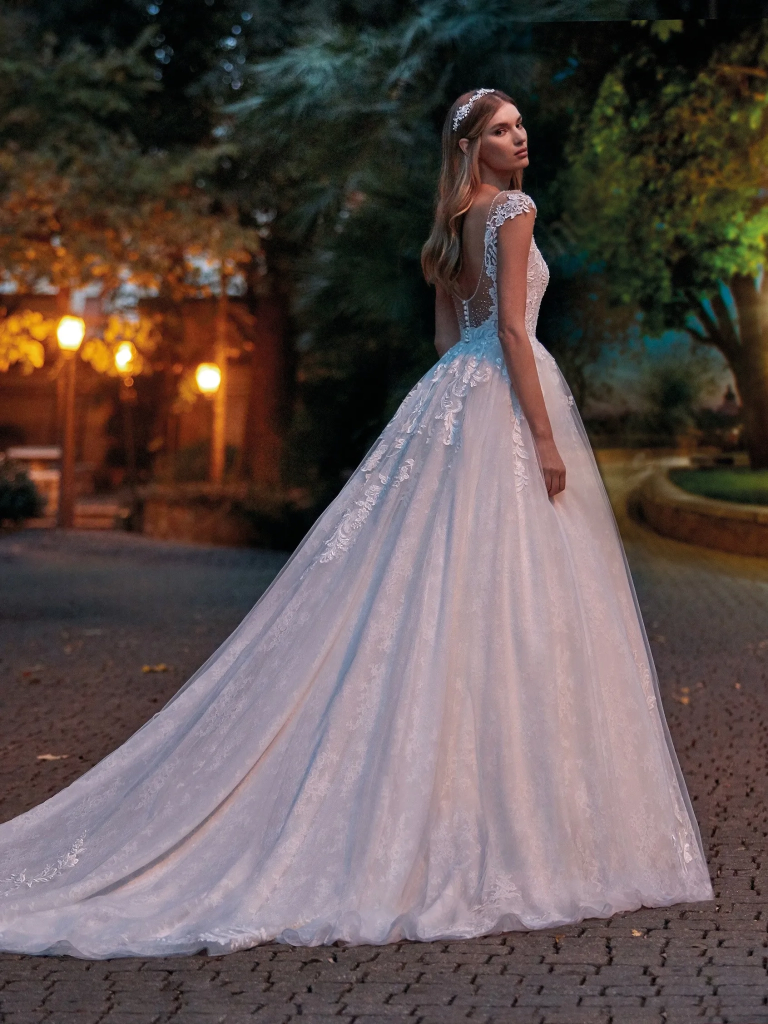 Incantevole abito da sposa con volume principesco e strascico. Il tulle della gonna è impreziosito da sottostrati di pizzo e il corpino fascia il decolleté con femminilità estrema.