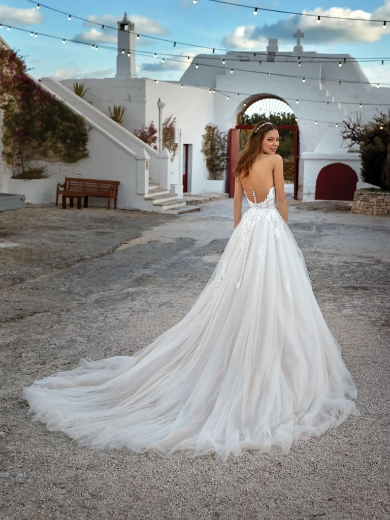 Incantevole abito da sposa principesco in tulle cipria con corpino in pizzo dal design moderno e lineare. Un vero incanto!