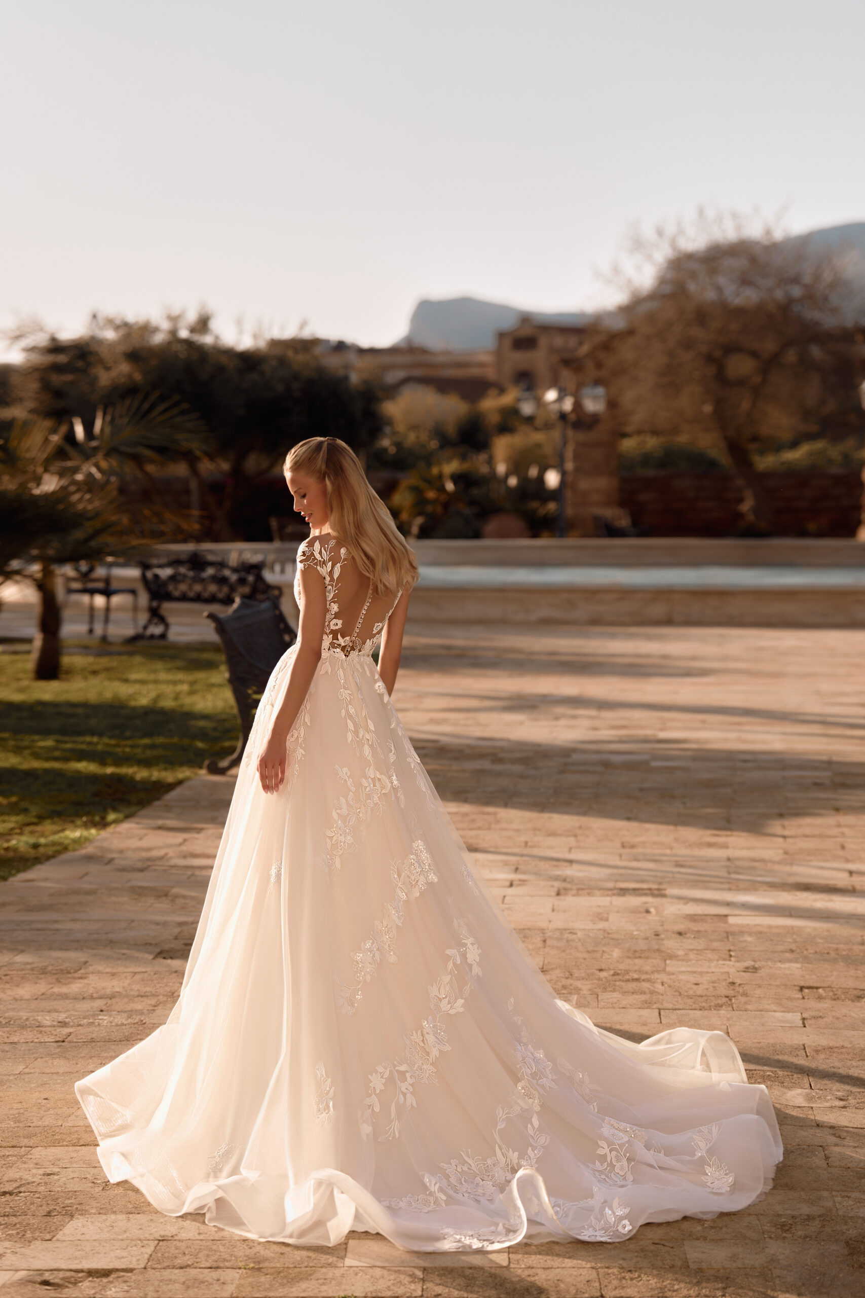 Ametista è un abito da sposa caratterizzato da corpino con schiena effetto tattoo, preziosamente ricamato con motivi floreali, si fonde armoniosamente con l’ampia gonna in tulle che si apre in uno strascico sontuoso e impalpabile. Ricami tridimensionali in pizzo e tulle ricamato disegnano un’eleganza senza tempo, fatta di luce, movimento e poesia.