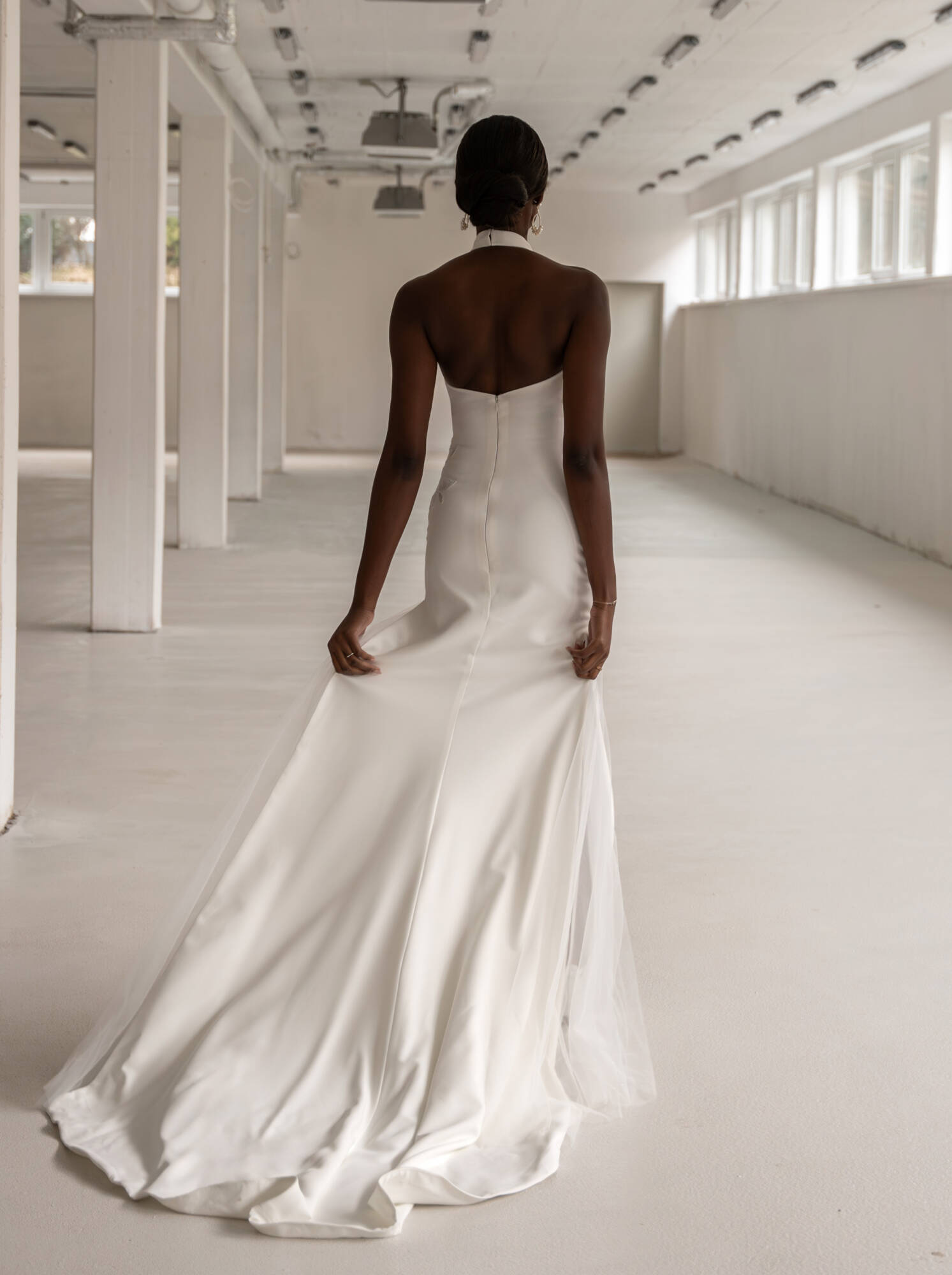 Linee essenziali e sensualità decisa per questo abito da sposa in crêpe liscio, con scollatura all’americana, spacco laterale con inserto in tulle e ricami floreali a rilievo che valorizzano il fianco. Perfetto per la sposa moderna che ama distinguersi con eleganza.