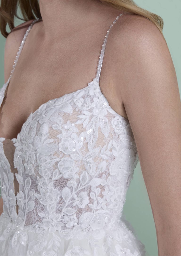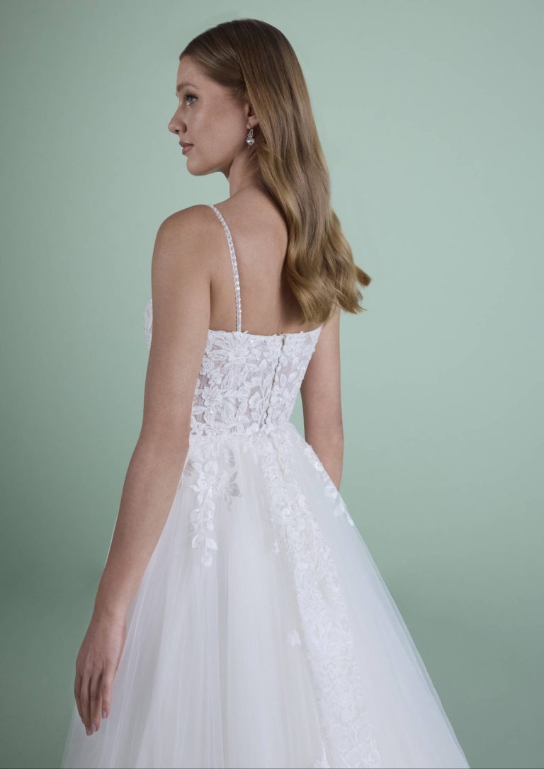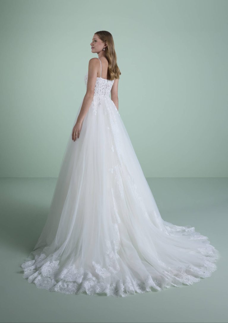 Abito da sposa avorio, realizzato in tulle e pizzo impreziosito da cristalli luminosi. Un modello tutto da scoprire. Vieni a indossare questo sogno principesco nei nostri Atelier, prenota qui la tua prova.
