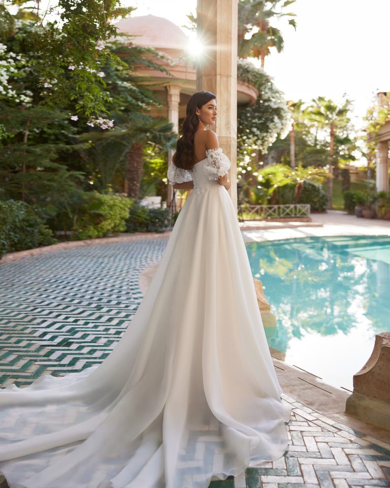 Frizzante e giovanile abito da sposa redingote realizzato in organza e guipure. Aroa è caratterizzato da un romantico scollo senza spalline e maniche a sbuffo in guipure staccabili, questo è un outfit da sogno di Adriana Alier.