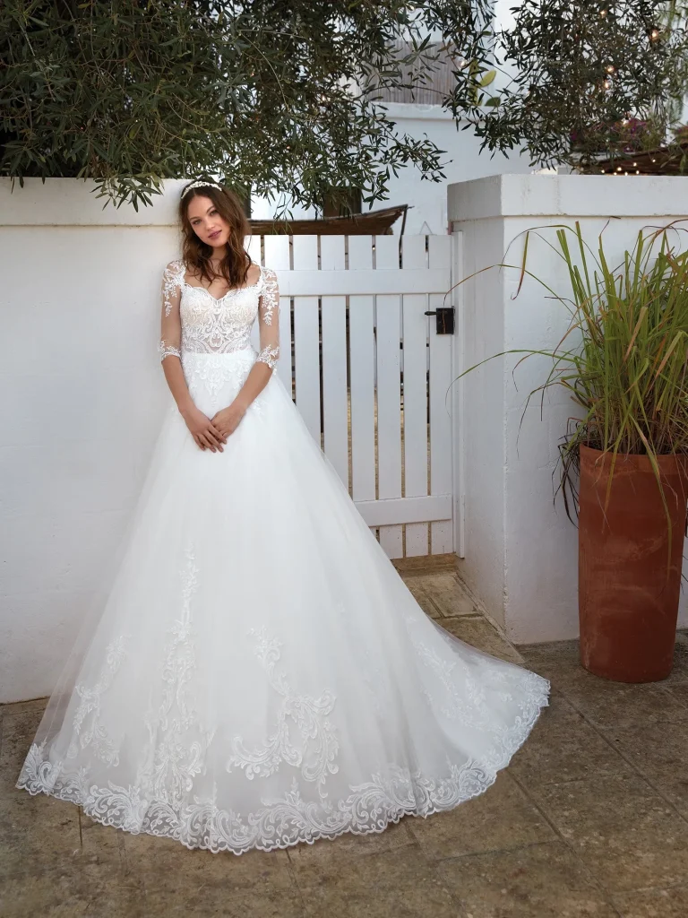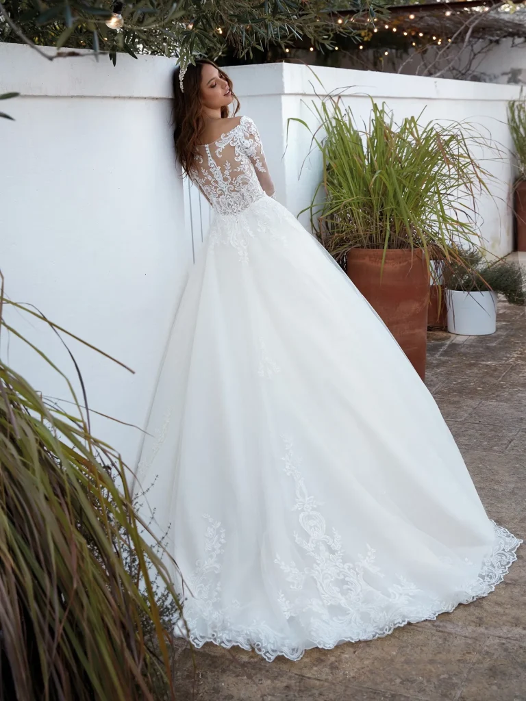 Abito da sposa con voluminosa gonna di tulle dalla linea ad A. Il corpino con ramage di pizzo e scollo a V è un vero incanto!