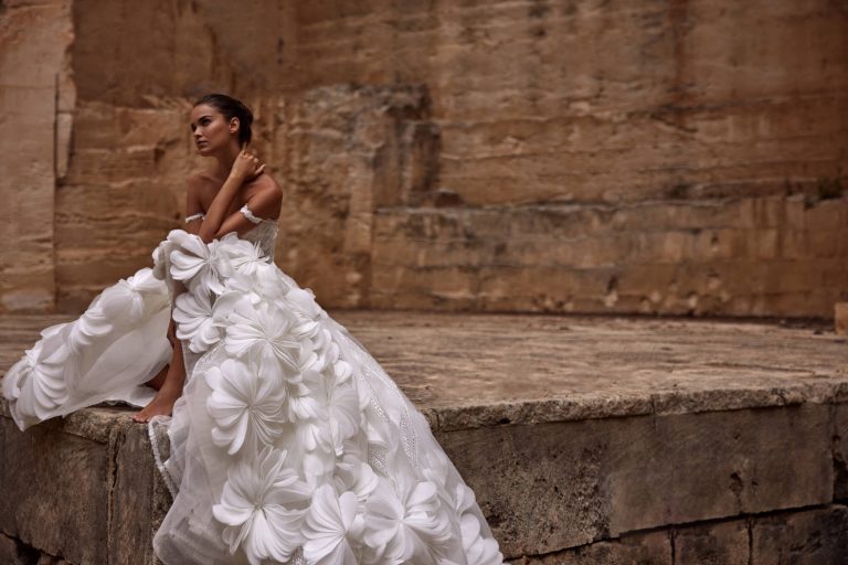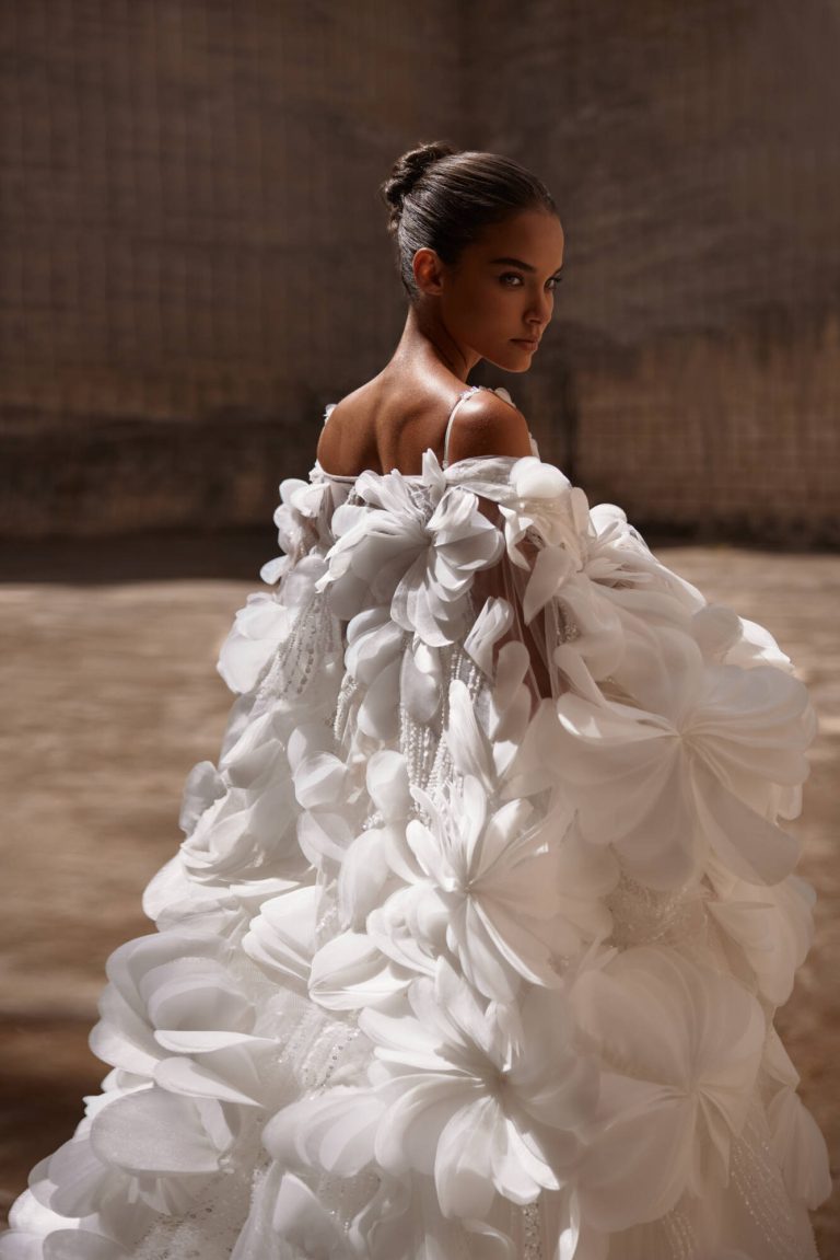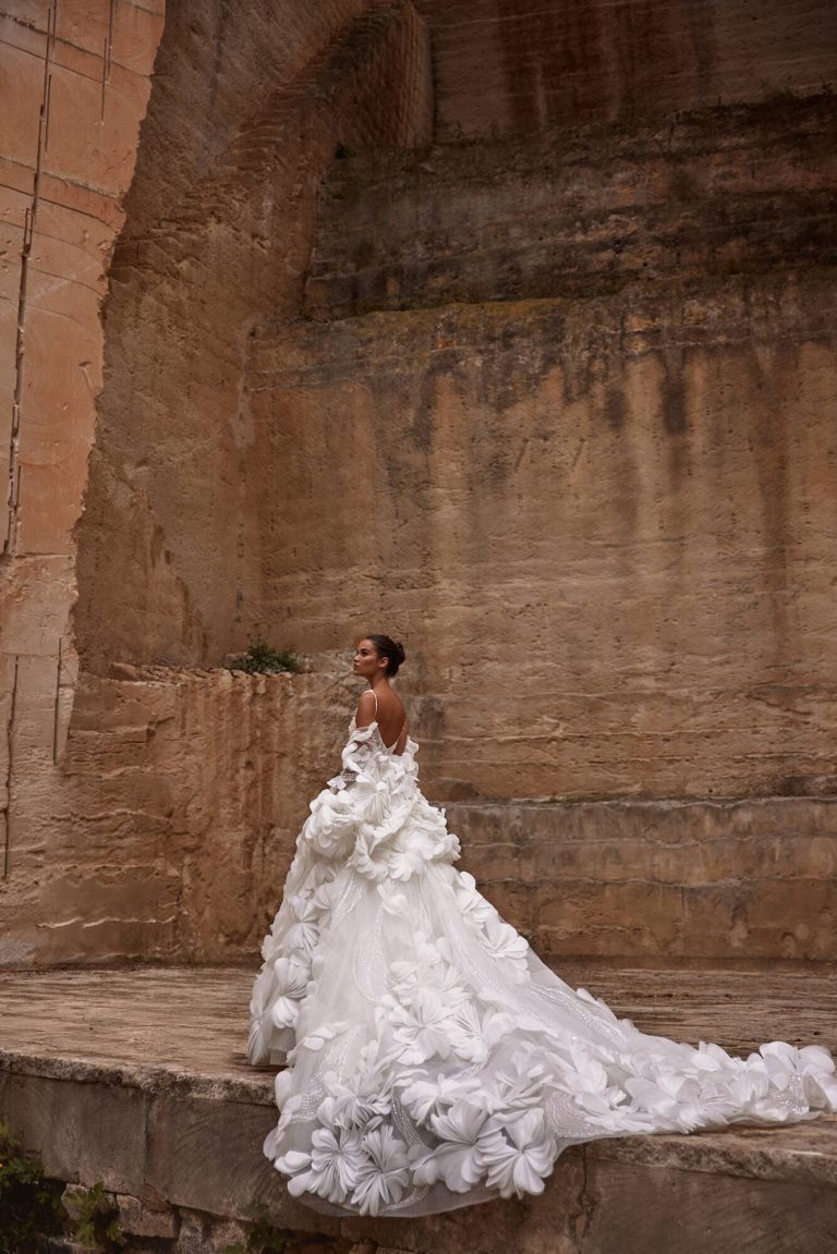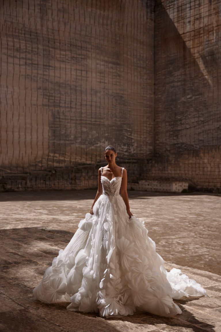 Ashlyn è un abito da sposa di alta moda, realizzato in tulle ornato con fiori di pizzo 3D realizzati a mano. Caratterizzato da un corsetto con stecche semitrasparente a forma di cuore su spalline sottili ornato con applicazioni di fiori 3D, perle e paillettes che scendono elegantemente dal corpetto alla gonna, formando un lussuoso e scintillante campo di fiori che culmina nella parte inferiore del vestito con volumetrici fiori meticolosamente hand made.
