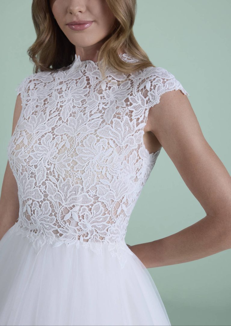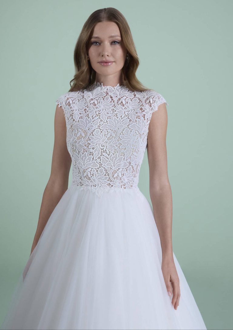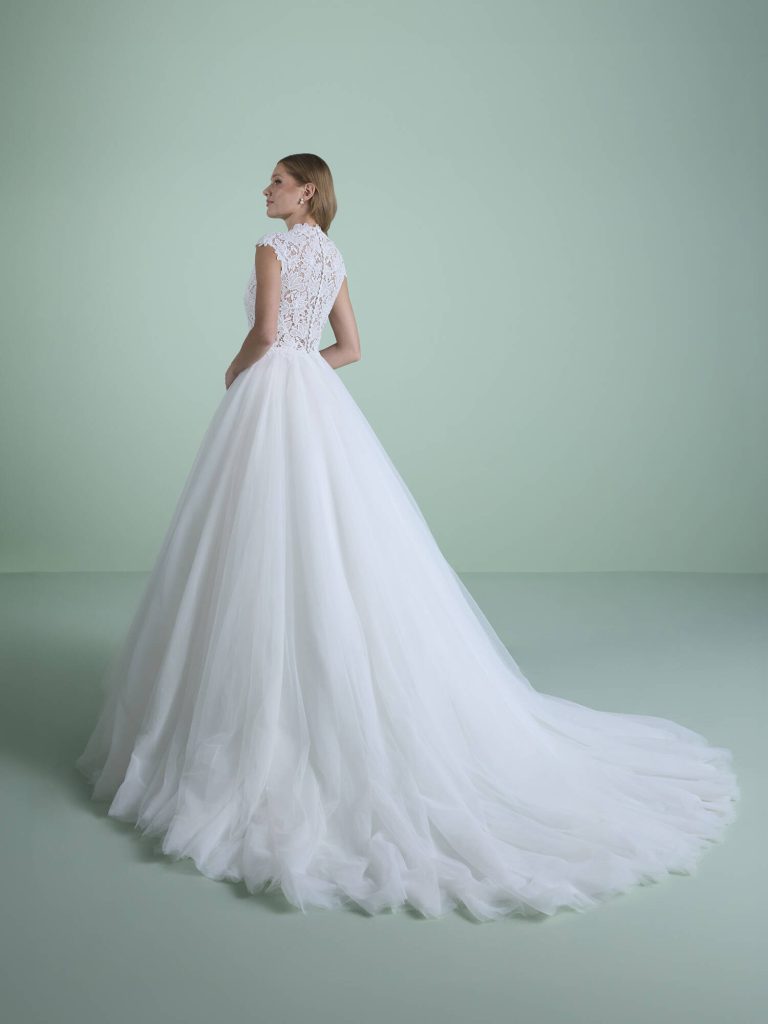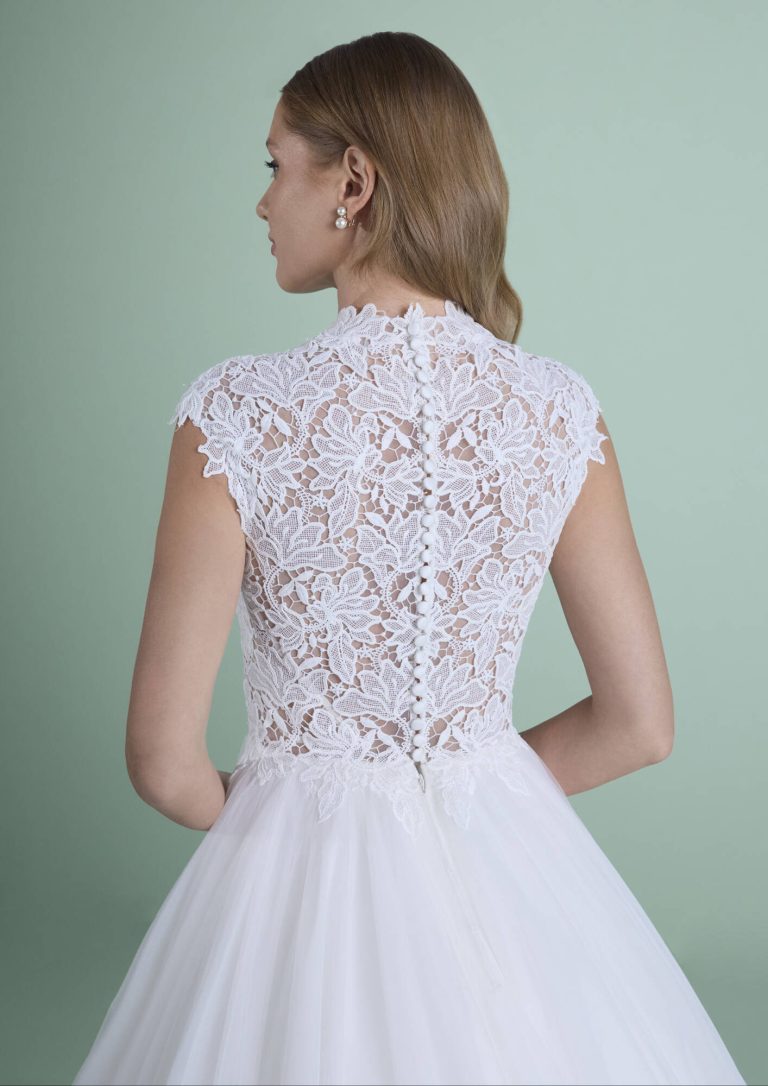Athenns è un abito da sposa in color avorio, realizzato in tulle e pizzo dal gusto romantico e raffinato.