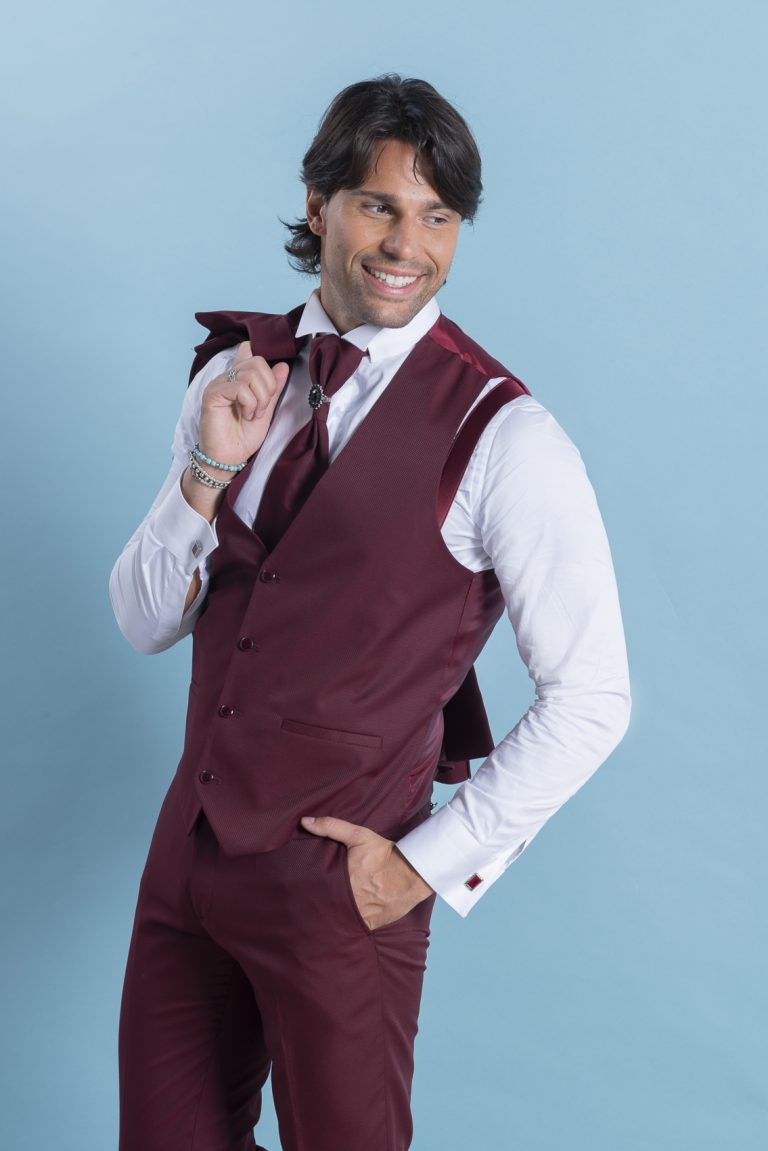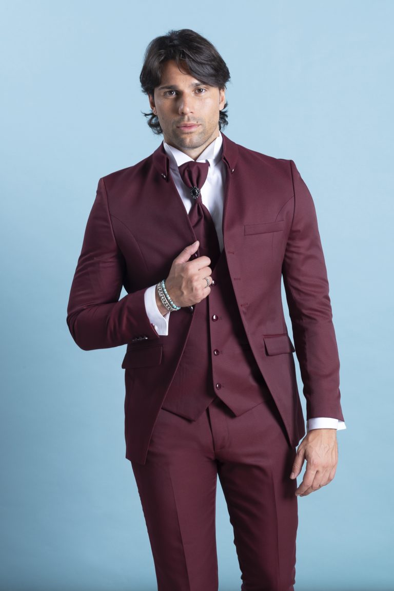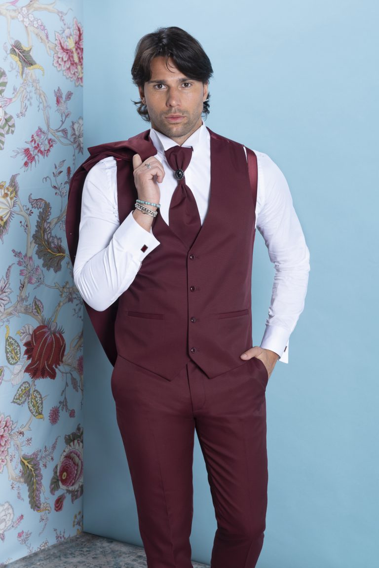 Abito da Sposo di alta moda, realizzato con tessuto jacquard, giacca con collo a camicia e gilet monopetto.