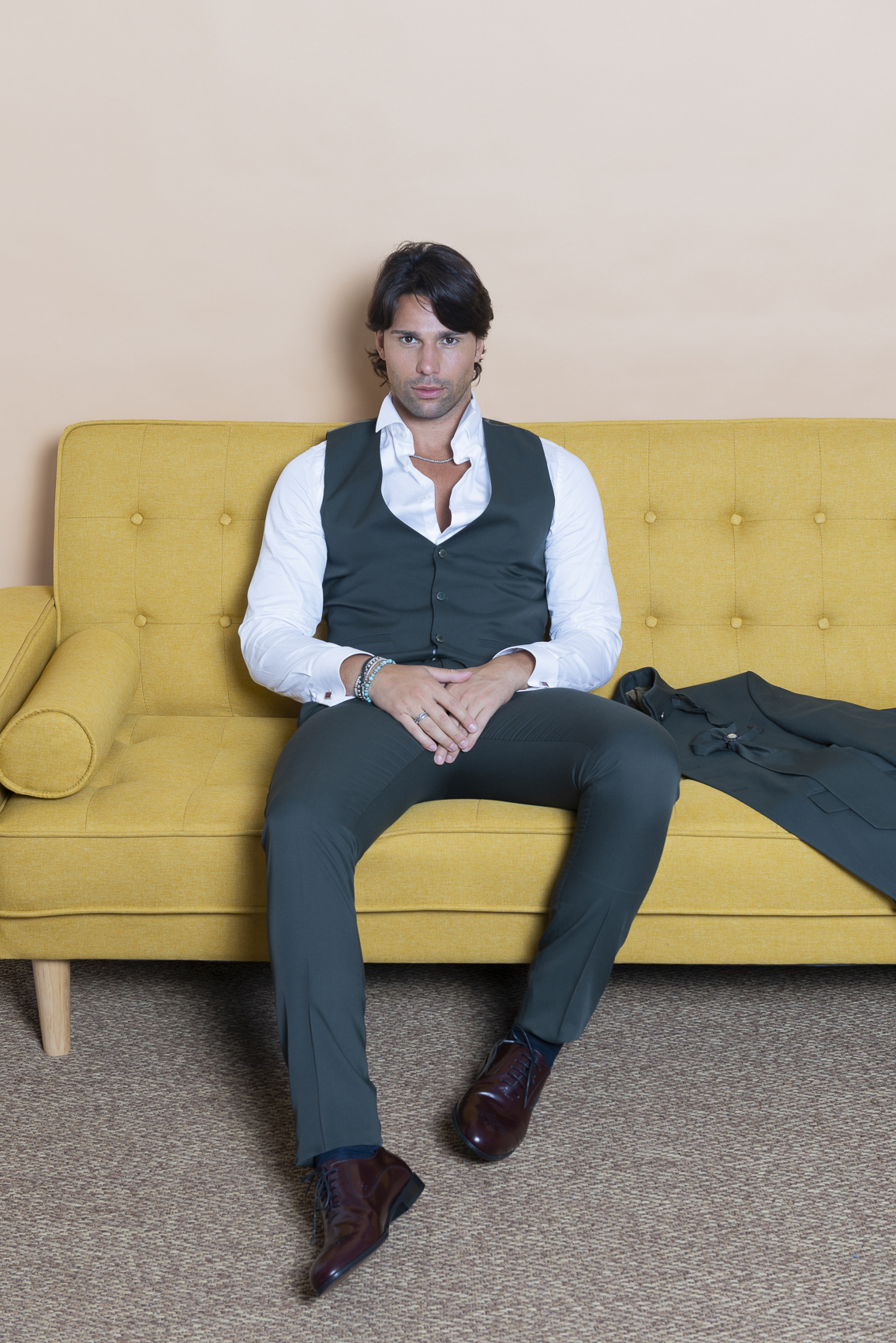 Abito da Sposo di alta moda, realizzato con tessuto jacquard color verde salvia scuro, giacca con collo a camicia e gilet monopetto.