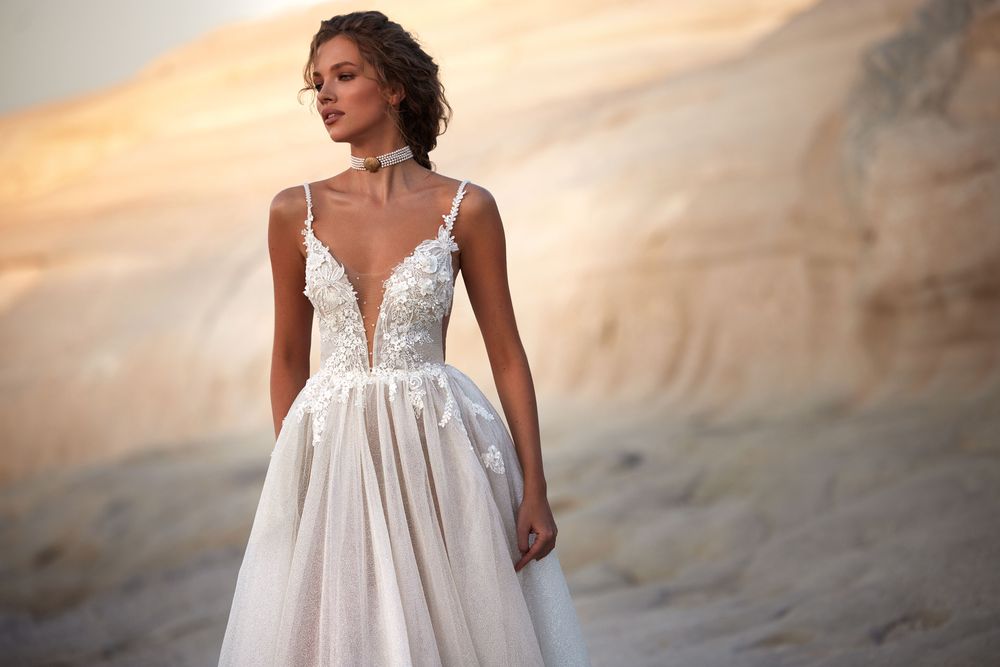 Scintillante abito da sposa a trapezio con spalline sottili. Caratterizzato da profondo scollo a V, applicazione floreale 4D sul corpetto, scollo a V e strascico midi.