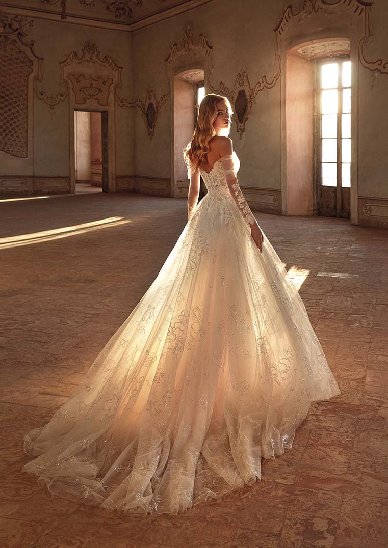 Preparati a rimanere incantata da questo gioiello ultra romantico di abito da sposa con scintillanti pieghe di tulle e squisite decorazioni in pizzo, profondo scollo a V e splendide maniche lunghe off-shoulder semitrasparenti. WOW!