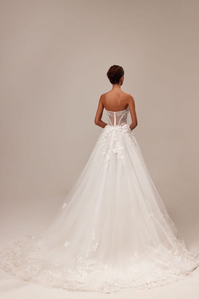 Abito da sposa a trapezio senza spalline impreziosito da applicazioni floreali 3D realizzate a mano e impreziosite da paillettes.