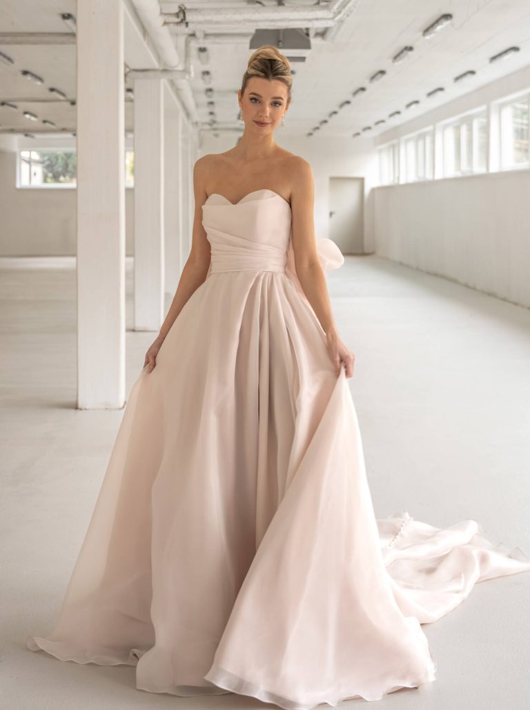Abito da sposa in organza rosata, con scollo a cuore e raffinato drappeggio sul corpino. La gonna ampia, impreziosita da pieghe morbide e un maxi fiocco sul retro, regala una grazia romantica e contemporanea