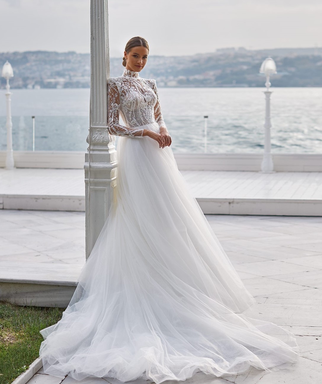 Elegante abito da ballo in tulle a maniche lunghe con corpetto semitrasparente decorato. Presenta un dolcevita, un top con applicazioni in pizzo e abbottonatura sul retro e una gonna in tulle gonfio con un lungo strascico.