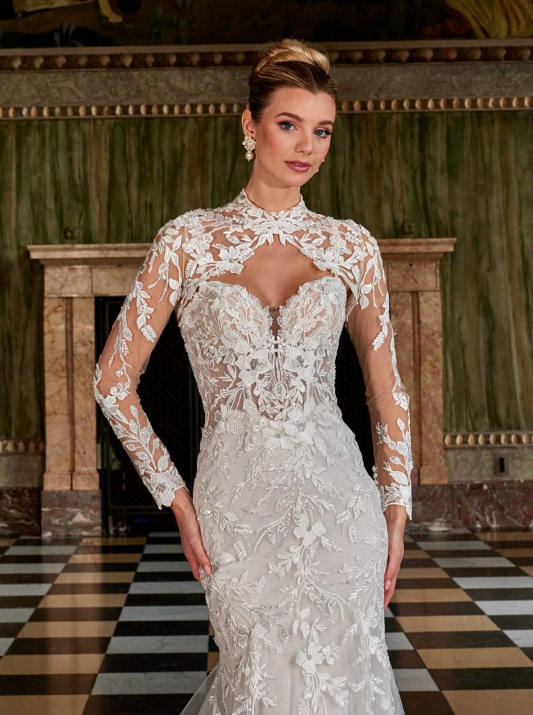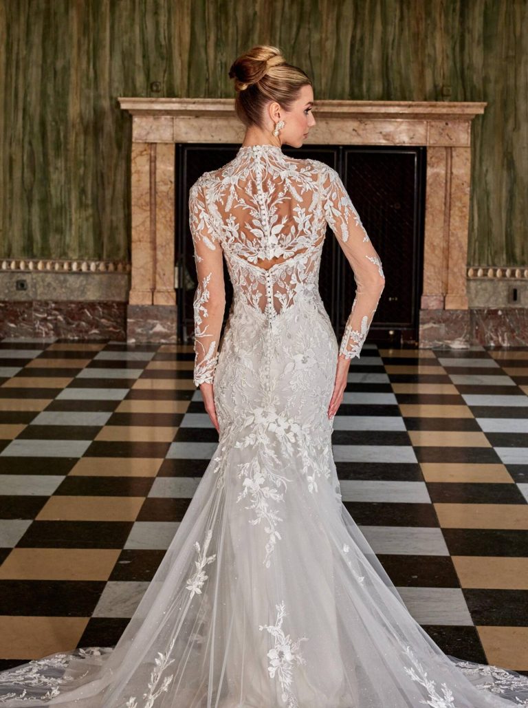 Abito da sposa in pizzo e tulle con maniche tattoo e strascico lungo – Modello Castiglia.