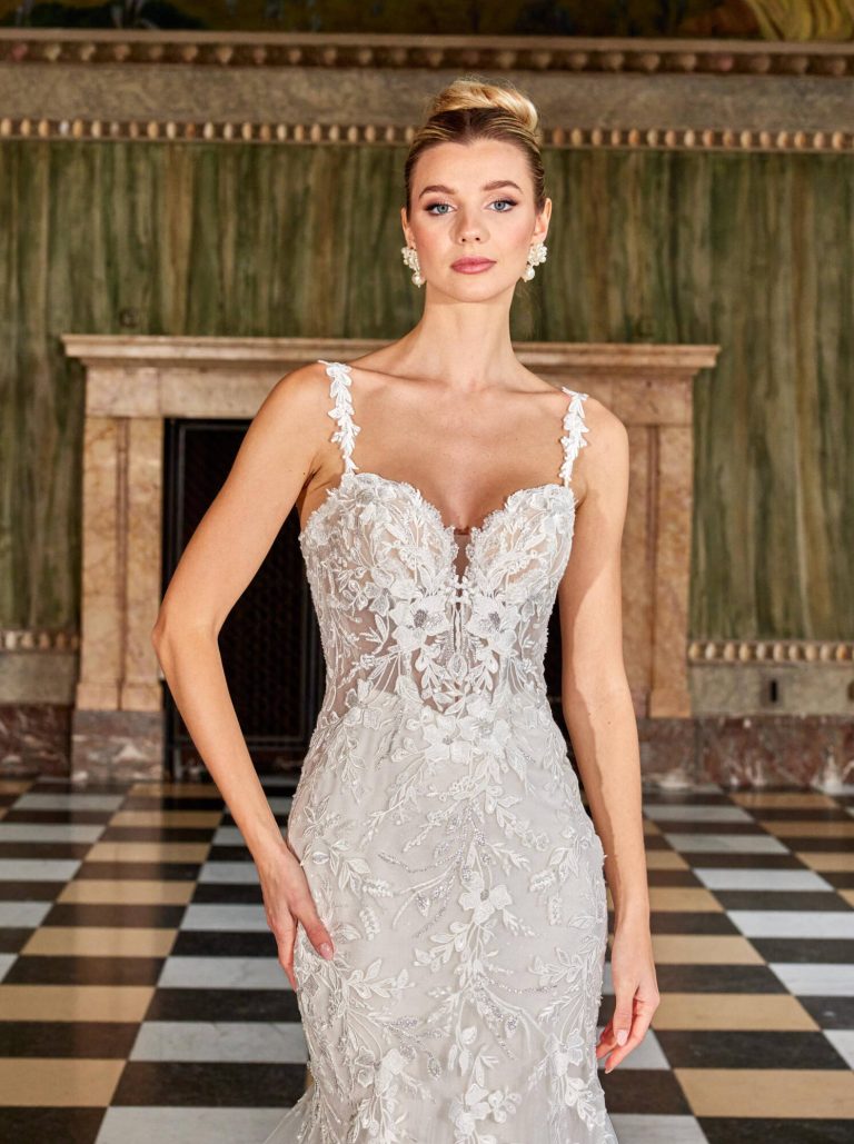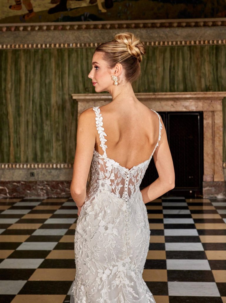 Un abito da sposa a sirena che incanta per la sua raffinatezza sartoriale. Il modello Castiglia è realizzato in tulle e pizzo avorio, con delicati ricami floreali che impreziosiscono l’intera silhouette, dal corpino al lungo strascico.