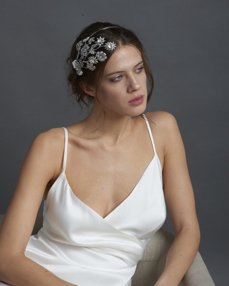 Raffinato cerchietto da sposa firmato Italiana Accessori, impreziosito da eleganti fiori in metallo e delicati cristalli luminosi. Un accessorio scenografico e romantico, perfetto per valorizzare raccolti morbidi o pettinature laterali.
