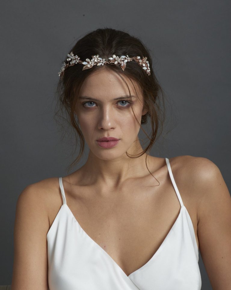 Un accessorio raffinato per l’acconciatura bridal, impreziosito da eleganti foglie metalliche, cristalli luminosi e perle delicate. La struttura in oro rosa dona un tocco romantico e moderno, perfetto per valorizzare un raccolto morbido o uno styling naturale.