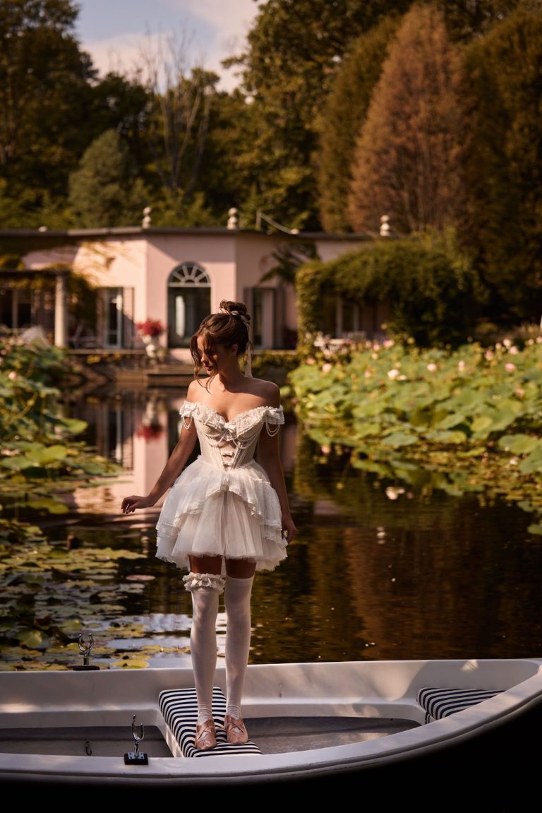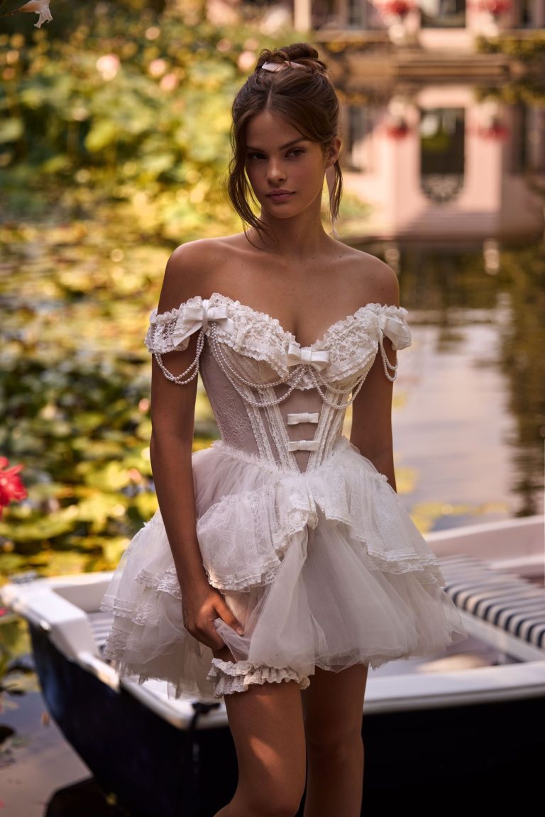 Mini abito da sposa Dolly con un tocco di ispirazione vintage. Realizzato in pizzo chantilly, il modello presenta una scollatura a cuore, maniche a spalle scoperte, un corpetto a corsetto decorato con ruches Lolita, delicati fiocchi e dettagli di perline. Può essere completato con una mini gonna Christian o una gonna Christian lunga, aggiungendo spazio al tuo tocco personale.