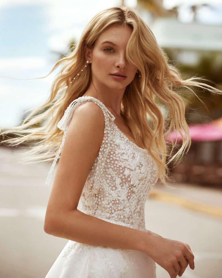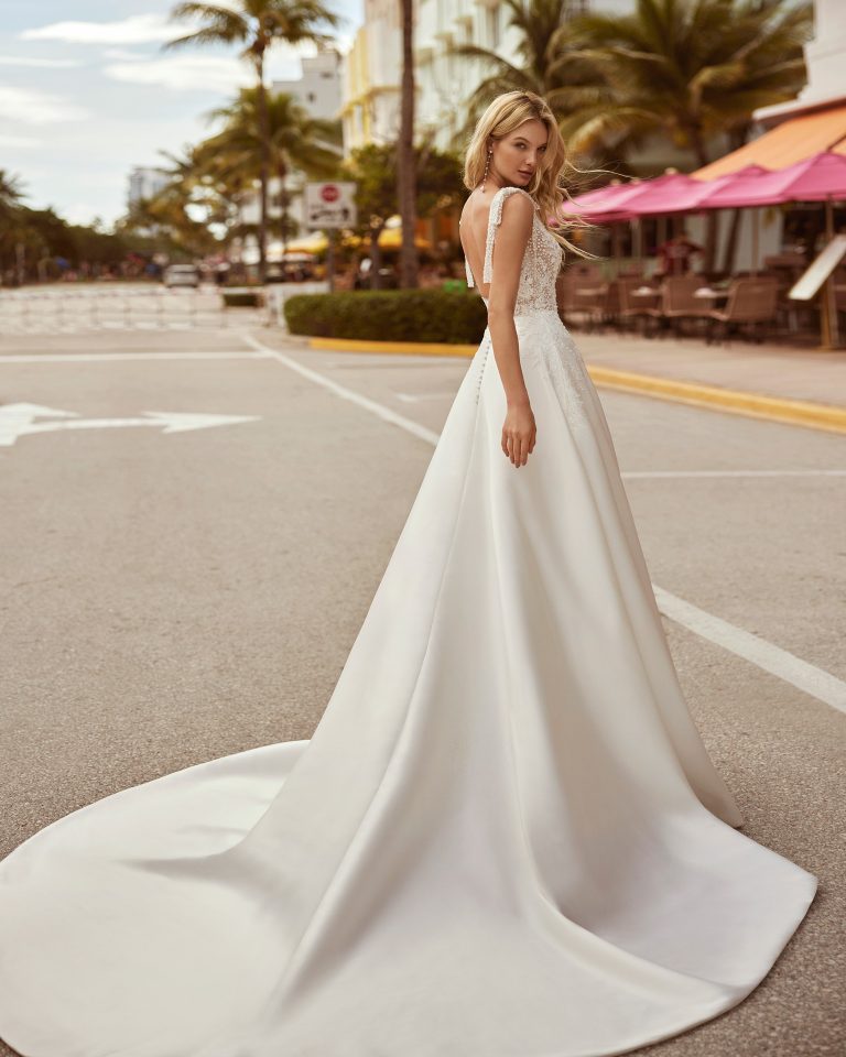 Abito da sposa in stile classico confezionato in mikado, pizzo e strass; scollo quadrato sul davanti e sulla schiena e spalline con fiocco. Attira tutti gli sguardi con questo modello delicato di Luna Novias.
