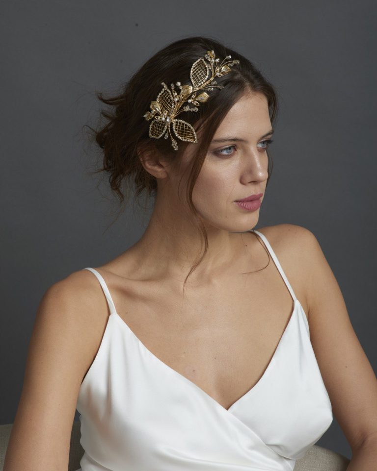 Un accessorio sposa scenografico e sofisticato, caratterizzato da foglie dorate lavorate a rete, cristalli e perle luminose. Perfetto per valorizzare raccolti morbidi o chignon laterali, dona luce e personalità all’acconciatura nuziale.