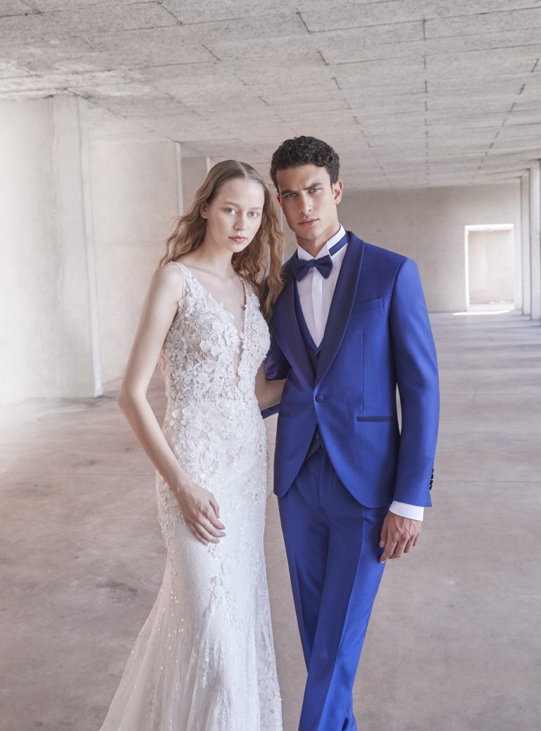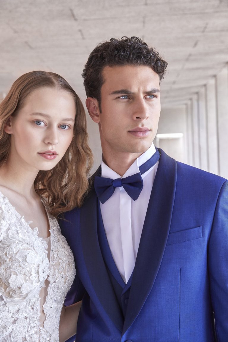 Smoking da sposo blu elettrico con revers nero in raso e papillon coordinato. Un abito moderno e di carattere per lo sposo che vuole sorprendere con stile e personalità.
