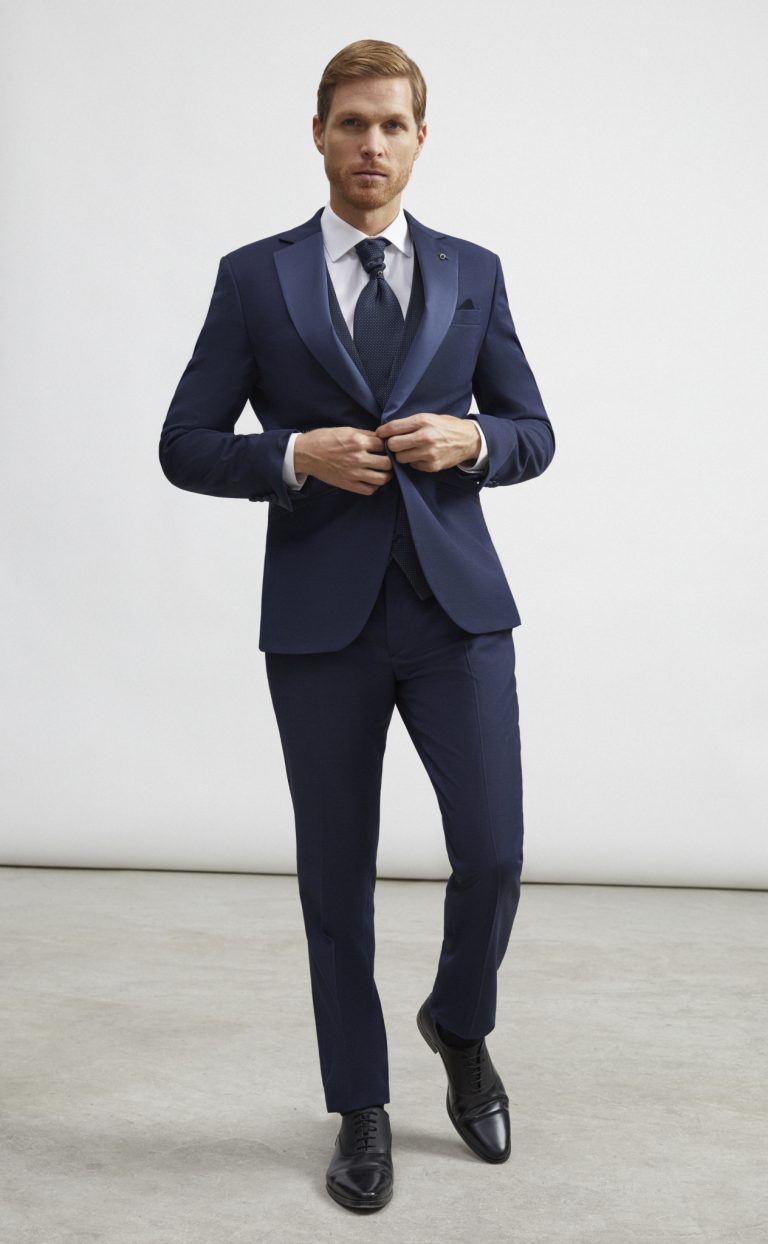 Abito da sposo blu navy con giacca slim fit, gilet coordinato e cravatta blu scuro. Un completo classico ed elegante per uno sposo che desidera uno stile impeccabile e senza tempo.