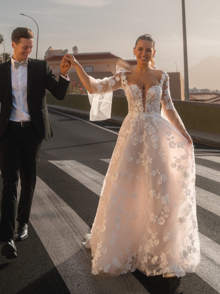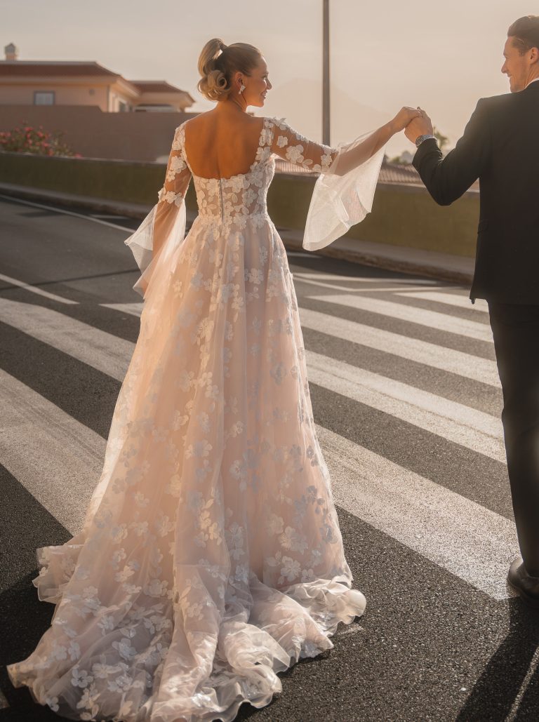 Abito da sposa in tulle con fiori ricamati in rilievo e maniche d’effetto. Il corpetto a cuore con profondo scollo valorizza il décolleté, mentre l’effetto nude dona un tocco etereo e romantico.