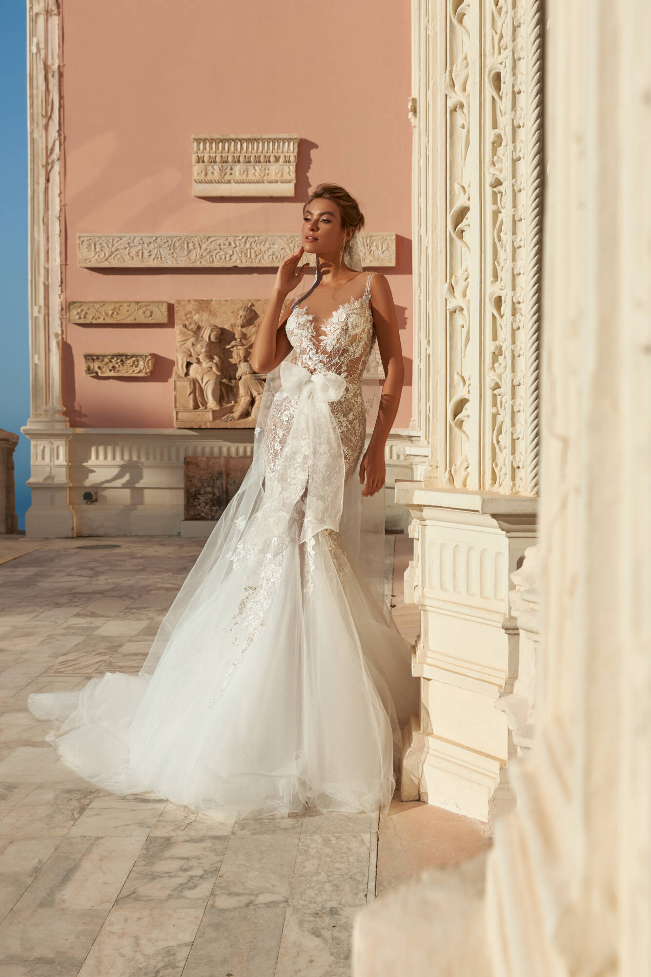 Abito da sposa dalla silhouette a sirena con cucitura sopra al ginocchio. Meravigliose le sue applicazioni in pizzo e i ricami di perline, perle e paillettes. Il fiocco in vita è staccabile per un vero effetto WOW! Il modello Darcia è realizzato principalmente in pizzo e tulle trasparente.